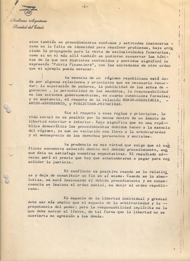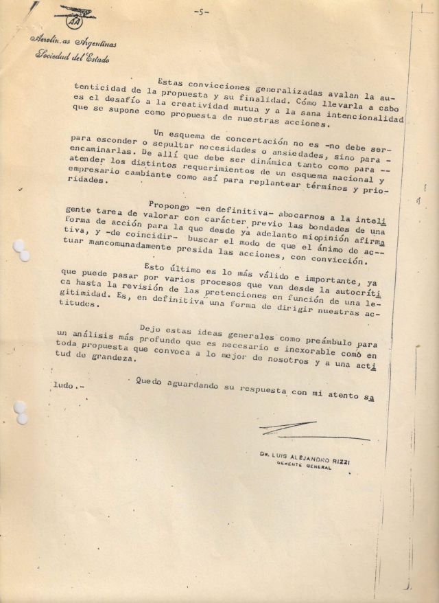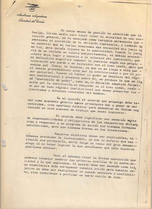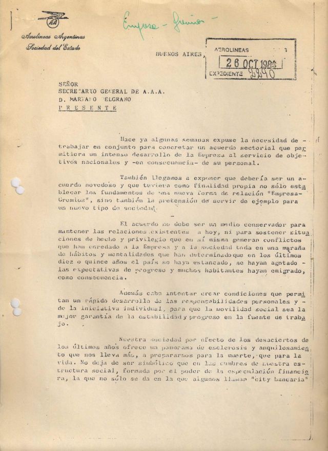 Adjunto para que el lector juzgue la sinceridad de mi intención la carta que el 26 de octubre de 1984 remití a todos los gremios aeronáuticos.