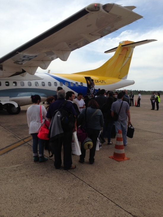 Agradecimos que no llovía pues como los ATR no están diseñados para acceder a las mangas telescópicas, su elemental escalerilla de acceso por la puerta ubicada en la parte trasera del avión no admite demasiado peso, razón por la cual el ingreso de pasajeros es muy lento y personalmente, pudimos subir luego de unos 15 minutos. Cuando nos sentamos, el respaldo del avión se reclinó y no pudimos enderezarlo. Luego del decolaje nos cambiamos para otro asiento más adelante y el respaldo estaba igual. Cuando regresamos, antes de despegar en el asunceño Silvio Pettirossi, la azafata quiso enderezarnos el respaldo infructuosamente. La puerta del baño tenía roto el cierre.