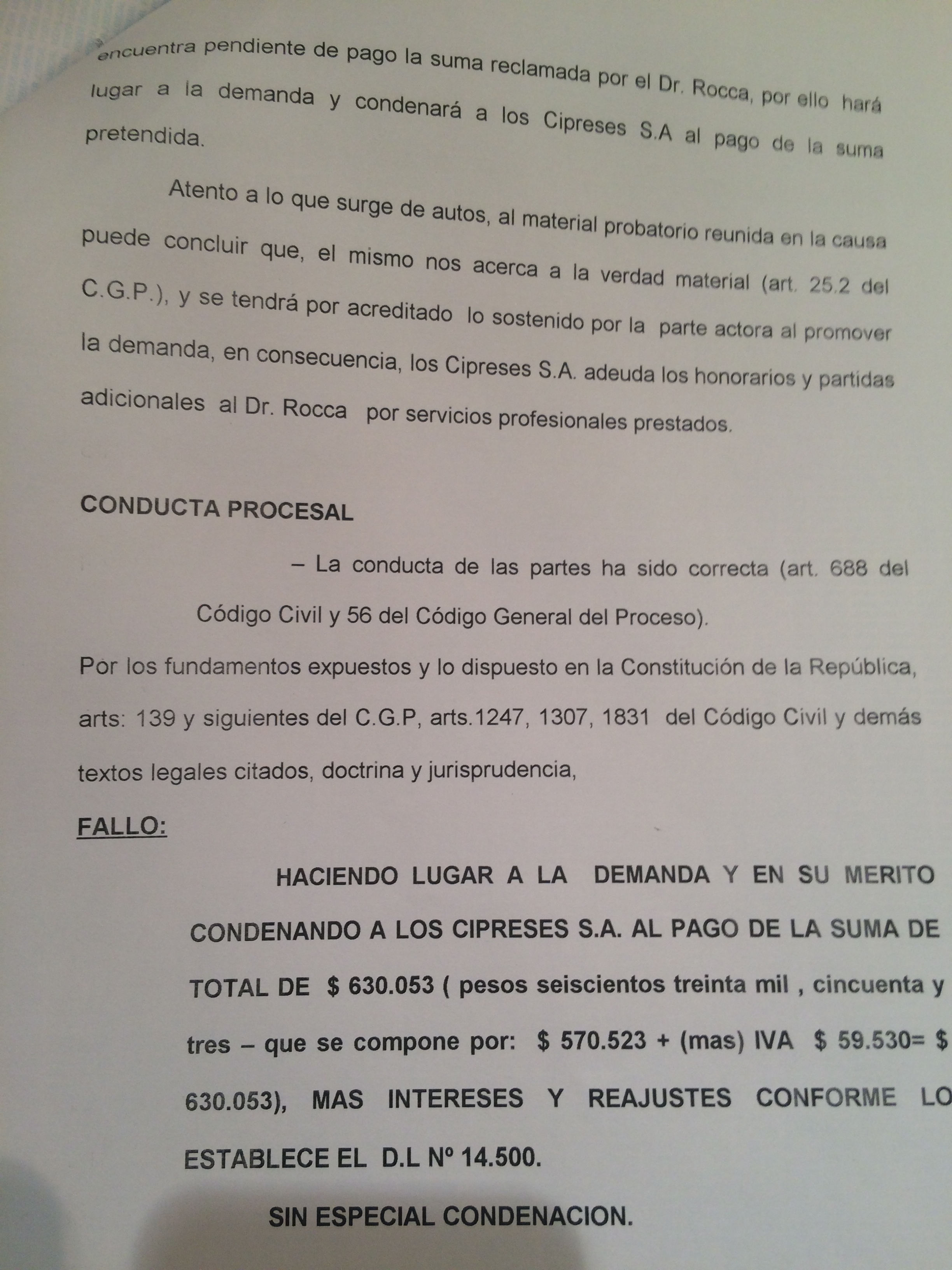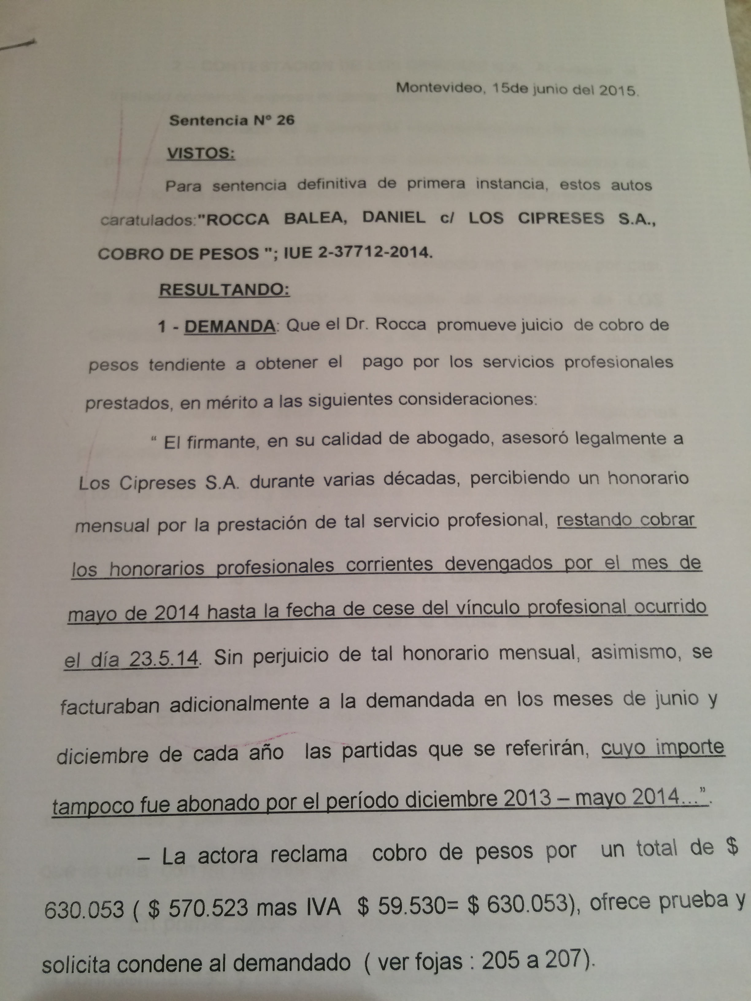 Que los tiempos están cambiando para Juan Carlos López Mena últimamente no quedaban dudas pero en esta joranada de lunes 15 de junio se dio una muestra contundente de ello. La Jueza Letrada del Juzgado de 20 Turno, Doctora Ana María Bello sentenció a Los Cipreses SA, la empresa madre del grupo Buquebus a pagarle al Doctor Daniel Rocca Balea $ 630.053 pesos uruguayos (más de 23 mil dólares) más intereses y reajustes en concepto de honorarios correspondientes al mes de mayo de 2014, fecha en que el letrado renunció al patrocinio de la empresa y de Lopez Mena.