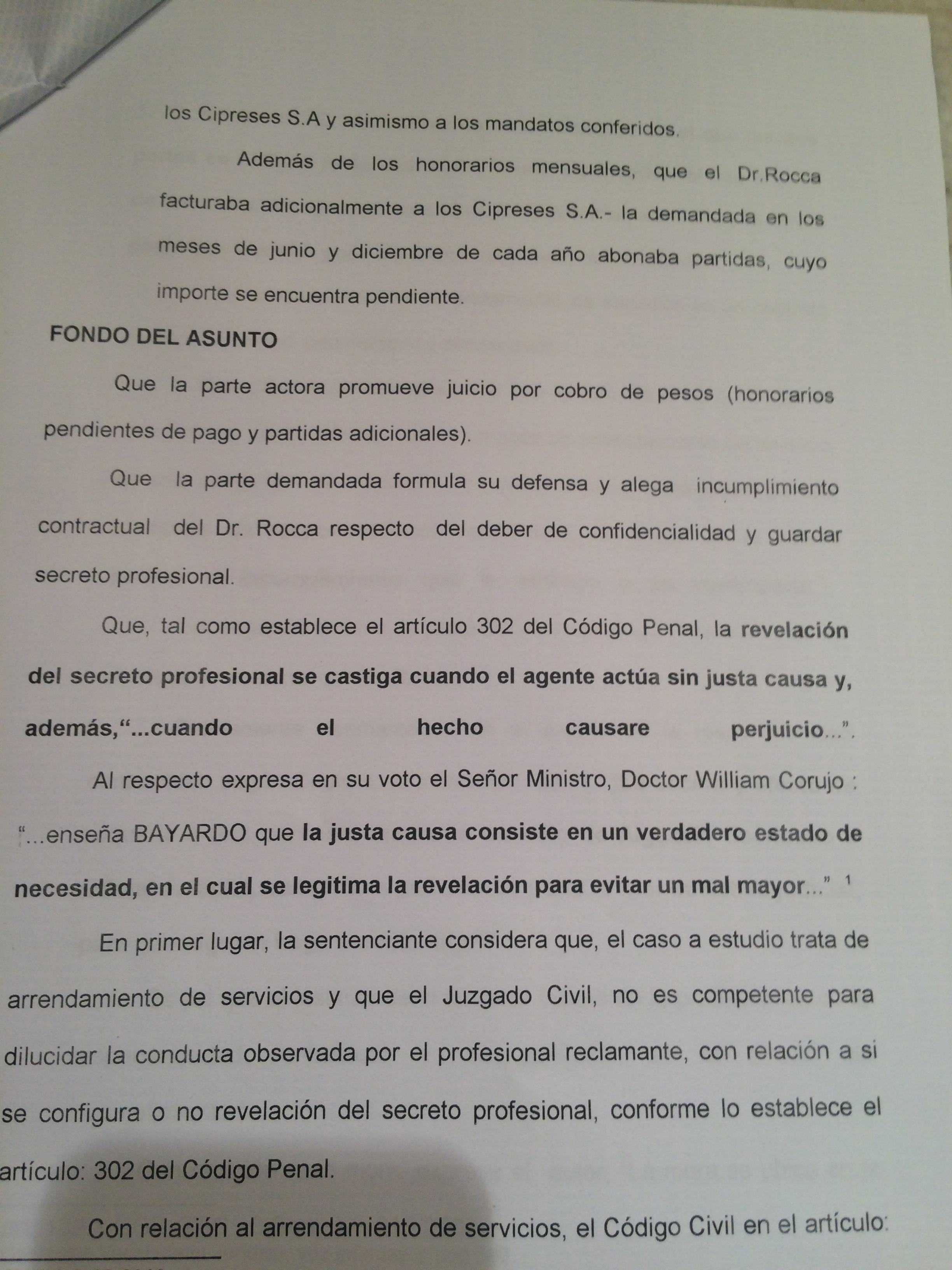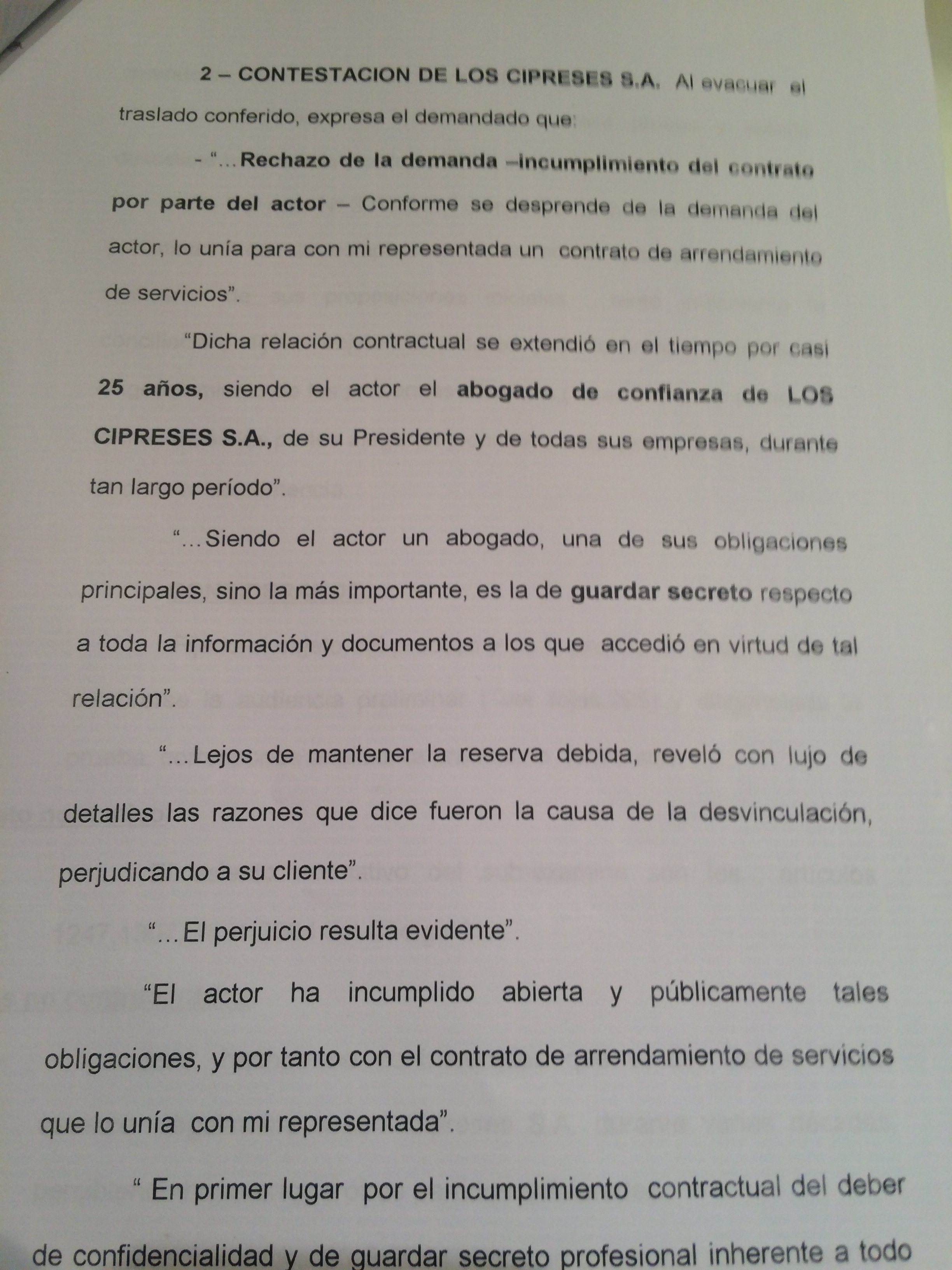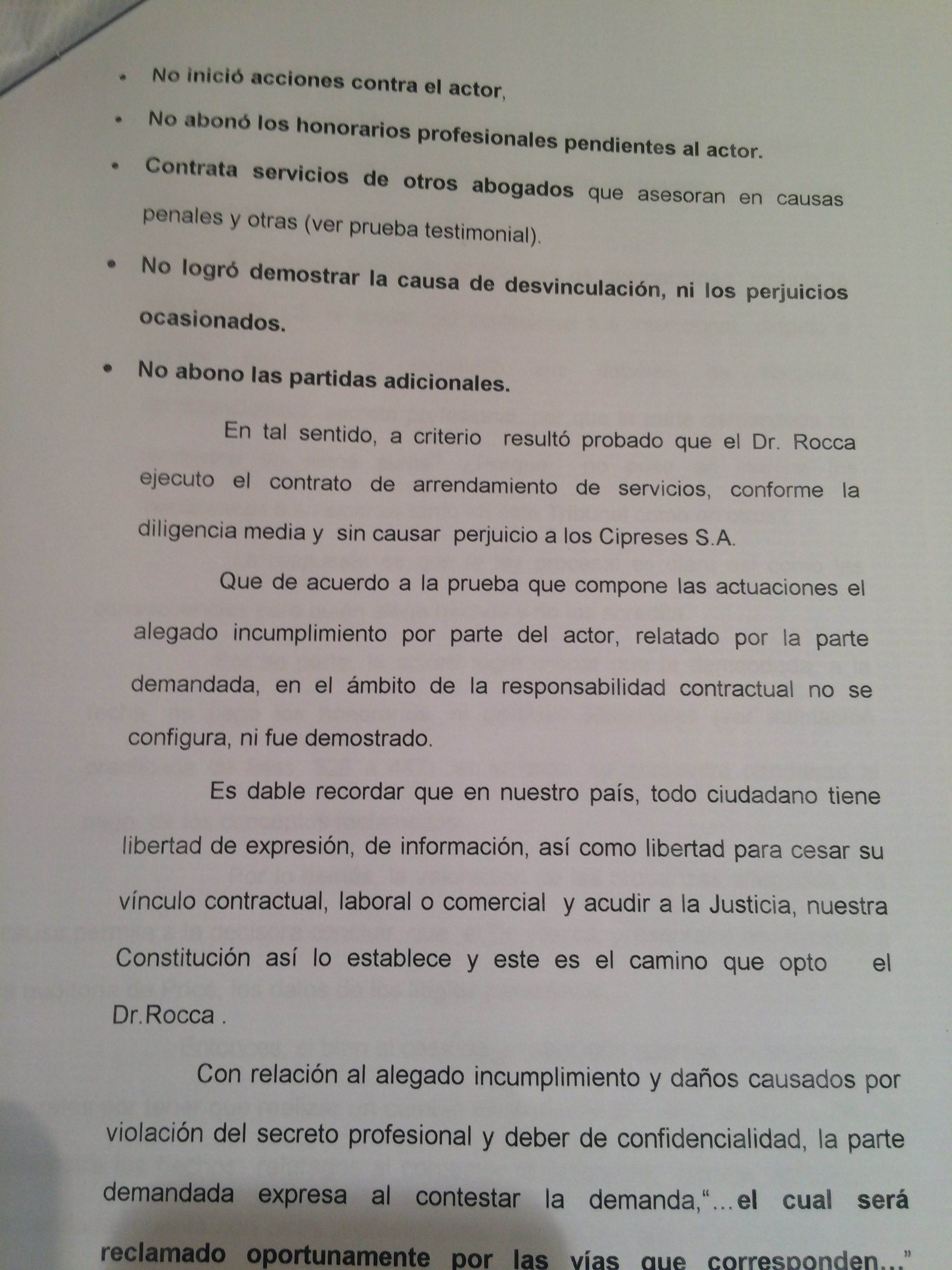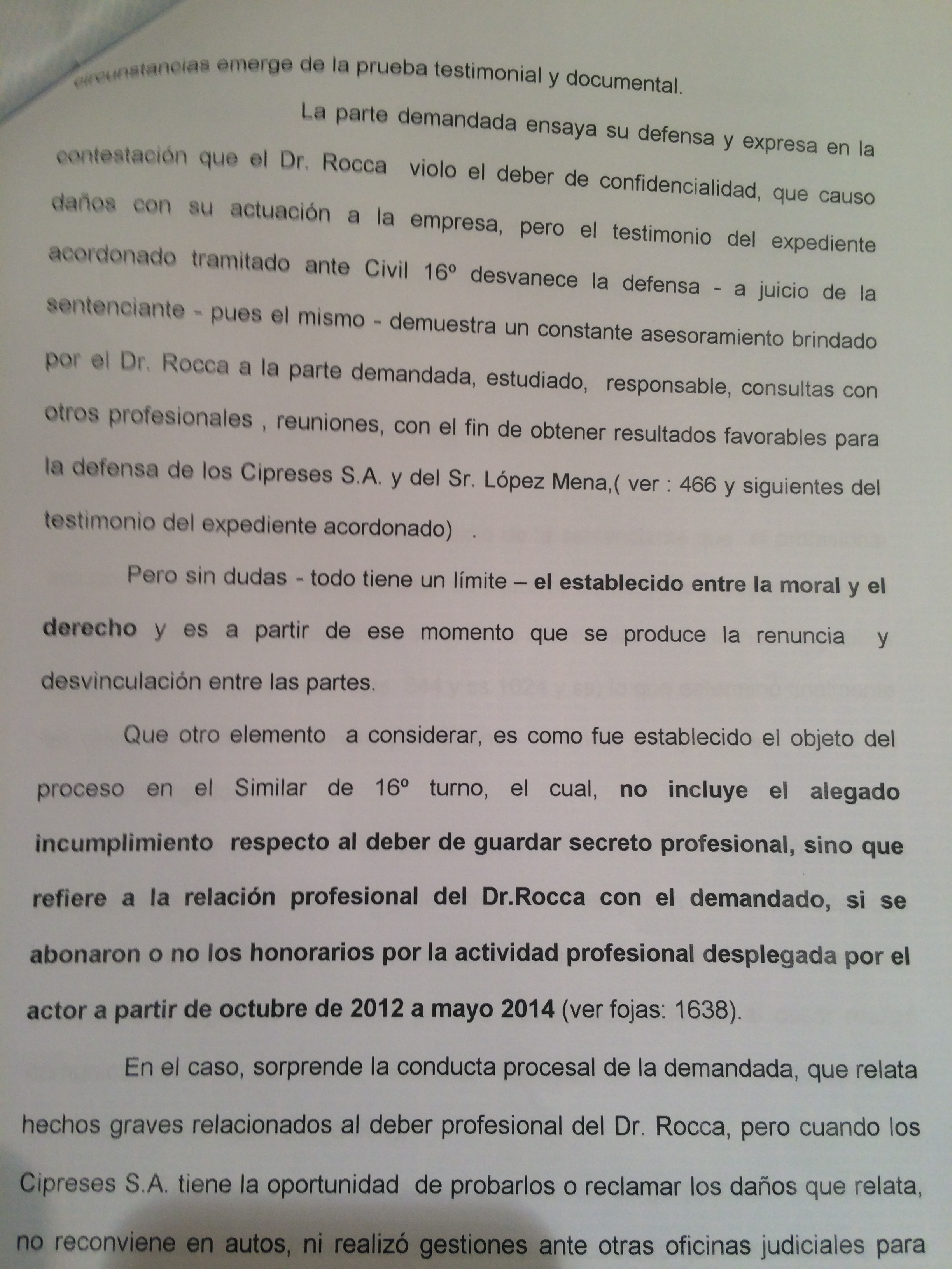 La defensa de Los Cipreses intentó cambiar el objetivo de la demanda alegando que Rocca había incumplido con la obligacion de secreto profesional pero la sede respondió que el juicio se trataba del cobro de pesos y que la actitud del Doctor Rocca desvanece la pretensión de la defensa ya que en todo momento había prestado asesoramiento a la parte demandada en la búsqueda de obtener los mejores resultados para Los Cipreses y López Mena.