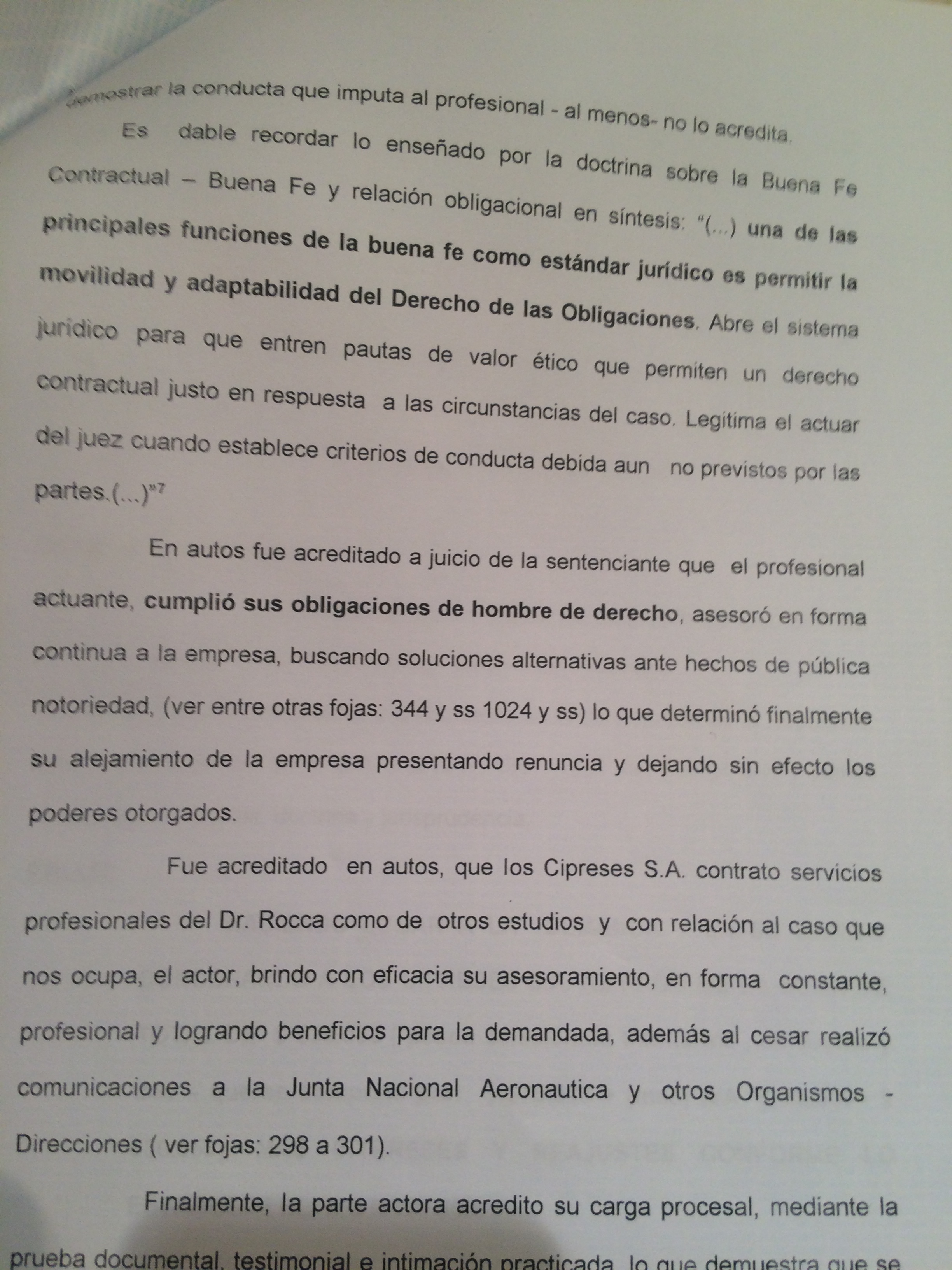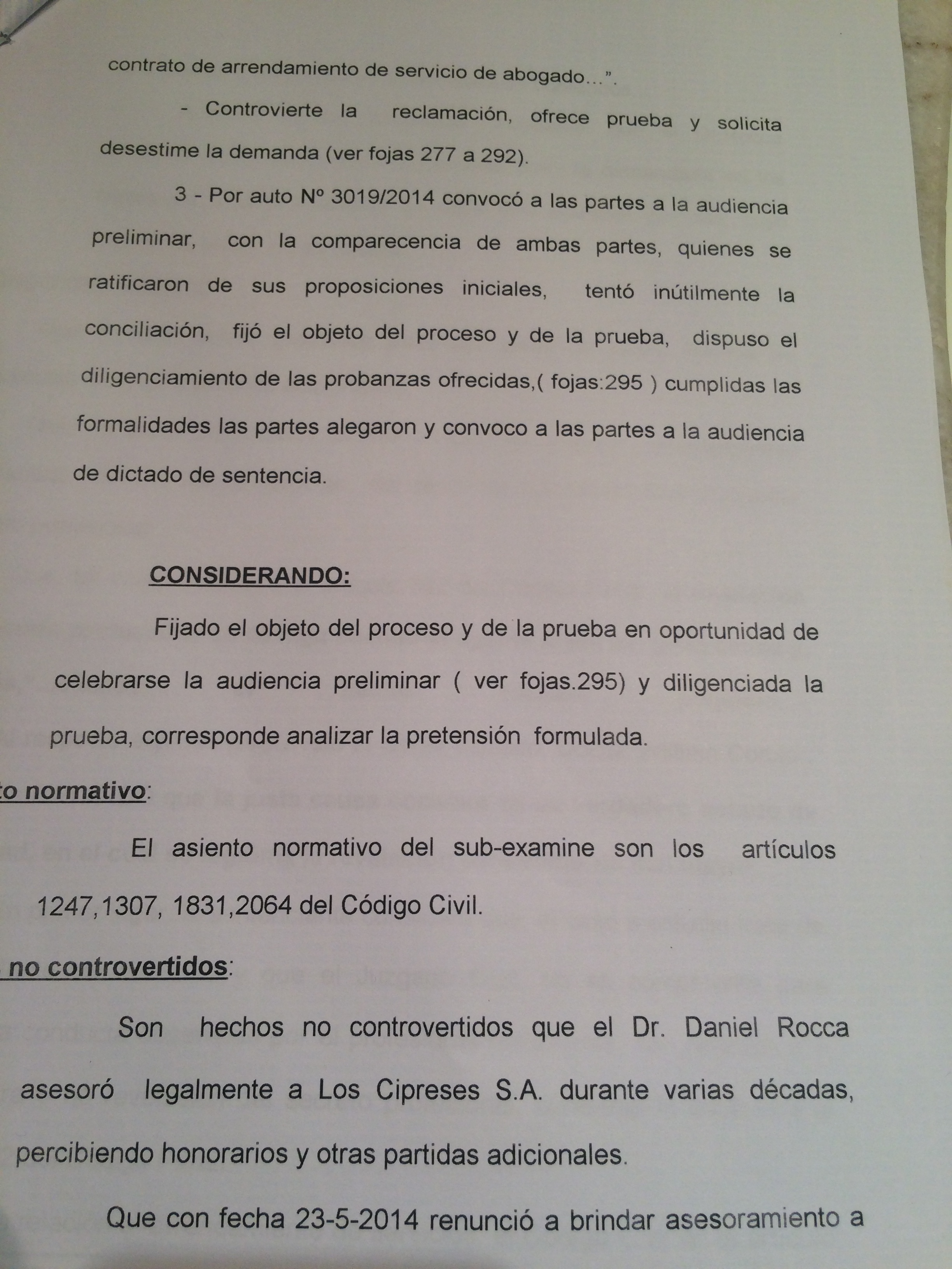 La Jueza refiriéndose al Doctor Rocca demandante de Los Cipreses, deja constancia que en todo momento cumplió sus funciones de hombre de derecho, asesorando y buscando alternativas ante hechos de pública notoriedad lo que determinó finalmente su alejamiento de la empresa, presentando renuncia y dejando sin efecto los poderes otorgados.