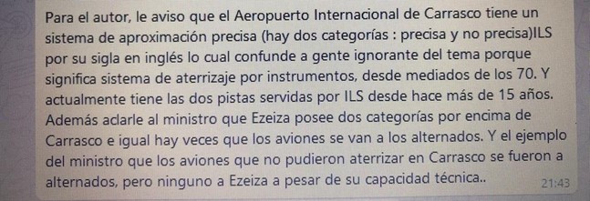 Escribimos en la presentación del artículo editorial Rossi, el de transporte el "necesario sistema ILS"; en ningún momento pensamos que se entendiese que no sabíamos que había ILS. Hacemos periodismo de aviación comercial pero jamás nos ufanamos de ser expertos. Afortunadamente, sí tenemos amigos expertos a quienes molestamos de continuo y cuando tenemos dudas, los consultamos. Hemos publicado numerosos artículos relacionados a ILS en el PDA, como muestra, solo le citamos uno por lo tanto, en este caso, como puede ver, sabemos de lo que hablamos. Con respecto a lo que dijo el ministro Rossi respecto a los vuelos alternados recientemente y su especial referencia (la suya de usted) a que no fueron a Ezeiza, permítame interpretar su argumento como justificación de la ausencia en el Aeropuerto de Carrasco del equipamiento necesario, lo cual corresponde que haga la DINACIA. Como comentario adicional, sabemos del malestar que en su momento creó en el ámbito de la autoridad aeronáutica, la inexplicable omisión en el contrato de concesión este tema. Es el Estado uruguayo quien debe hacer frente a esa inversión y es el destino turístico Uruguay el que precisa un aeropuerto con la mejor categoría posible. No nos debe importar adonde alternan los vuelos que no pueden bajar en Carrasco, nos debe interesar solamente que bajen en él.