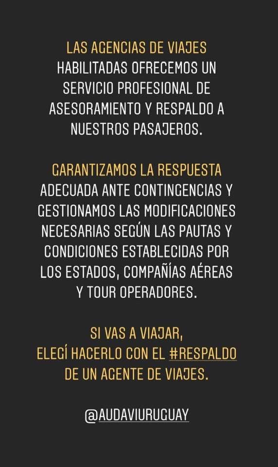 En los momentos de crisis como el actual, cada uno de nosotros debe confiar en quienes saben. Los médicos, los economistas, los abogados, o sea, en aquellos que están formados para actuar con profesionalismo, con conocimiento. Pasa exactamente lo mismo con los viajes. Si bien "el mundo es menos ancho y menos ajeno" con el avance de la tecnología, se están sucediendo los problemas de todo tipo en las más diversas situaciones a lo largo y ancho del globo. Yo nací y moriré agente de viajes, a pesar de mis treinta y cuatro años en la comunicación. Sé muy bien de lo que hablo, por ello, comparto el mensaje de la Asociación Uruguaya de Agencias de Viajes, AUDAVI.