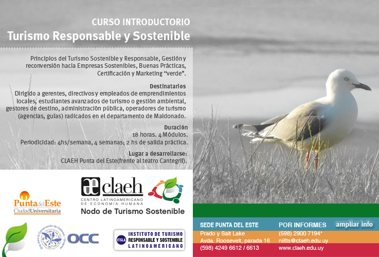 Nuestra amiga Bárbara Gimpel, quien desde hace un buen tiempo viene trabajando en Desarrollo Institucional del CLAEH, nos informa: "Con miras de generar nuevas áreas de capacitación y enseñanza, acordes al desarrollo inteligente y creatividad en los territorios, es que nos planteamos una alternativa obvia para CLAEH Punta del Este: incorporar el Turismo. Por esto y como introducción a las diferentes alternativas, entre ellas un Diplomado, generadas para el 2013 es que este año lanzaremos nuestro NODO DE TURISMO SOSTENIBLE con este curso (click aquíí).