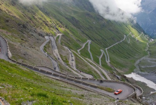 El Paso del Stelvio conecta la zona lombarda de la Valtellina con la localidad de Merano, mediante 48 curvas cerradas situadas a más de 2.700 metros de altitud, con grandes pendientes y puntos en los que se vuelve muy estrecha. Lo bueno es que al menos apenas hay tráfico.