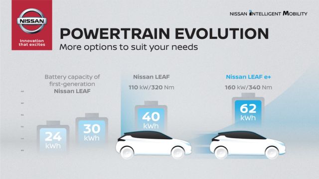 Pues si, la versión básica del LEAF se entrega con 40kWh de capacidad de carga, mientras que la versión PLUS se ofrece con 62kWh, y esto es sólo una pequeña prueba de la evolución en temas de carga, capacidad y prestaciones en la tecnología eléctrica. Esto en términos reales significa unas 226 millas de autonomía, lo que amplía la gama de usuarios a quienes dan al automóvil más uso que el de ir de casa al trabajo y regreso.