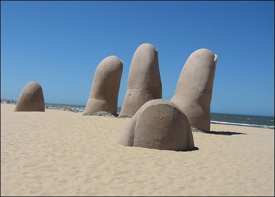 En una presentación que circula por internet con el título de “Esculturas locas” que se encuentran en varias ciudades del mundo, figura la Mano de la playa Brava, emblema de Punta del Este. Una vaca que se derrite, en Budapest, un rinoceronte gigante en Potsdam, un grifo gigante que parece flotar en el cielo de Càdiz , son algunas de las curiosas esculturas del mundo, entre las que se encuentran los dedos de la Playa Brava del escultor chileno Mario Irrarazabal