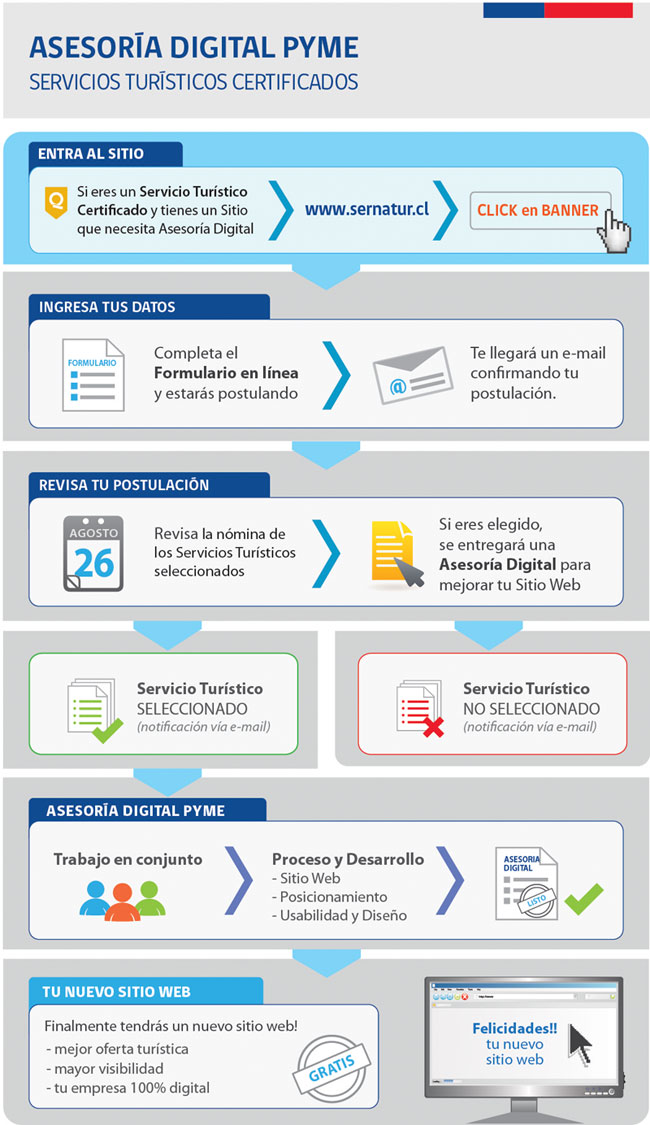 Santiago, viernes 19 de julio de 2013.- Esta mañana, el Subsecretario de Turismo, Daniel Pardo, lanzó una nueva herramienta que entregará el Servicio Nacional de Turismo (SERNATUR) a la pequeña y mediana empresa turística en apoyo al emprendimiento. Se trata de la Asesoría Digital Pyme que beneficiará a 100 pymes de manera gratuita y que les permitirá mejorar sus sitios web y así fortalecer la promoción de su oferta.