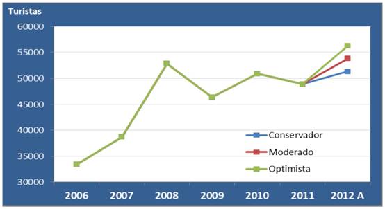 Proyección de la llegada total de turistas extranjeros según escenario, periodo verano 2012 (enero-febrero)