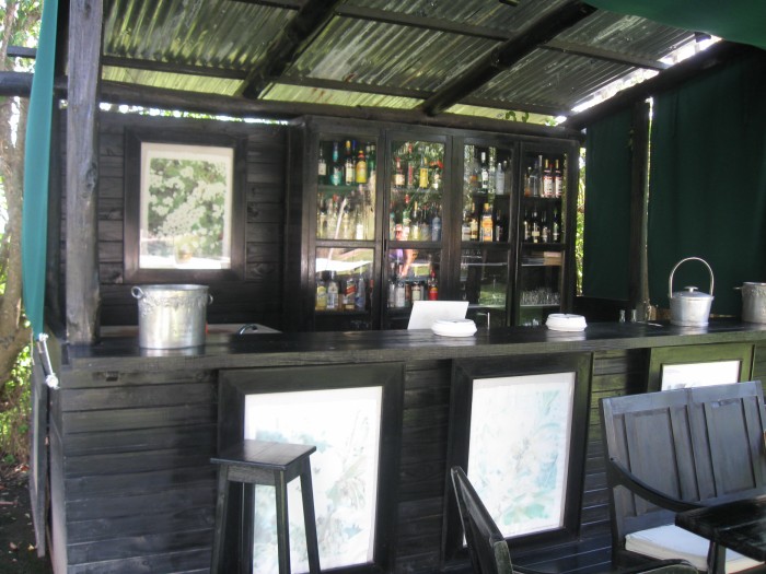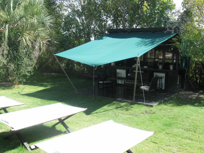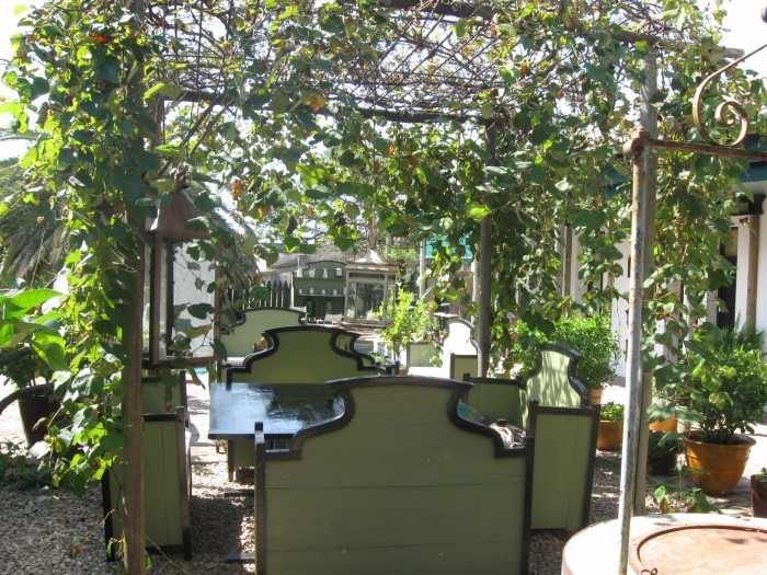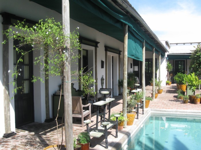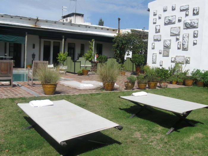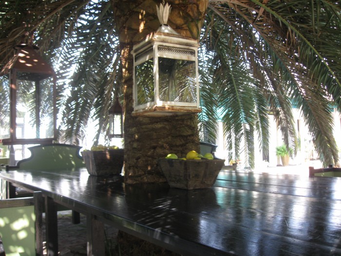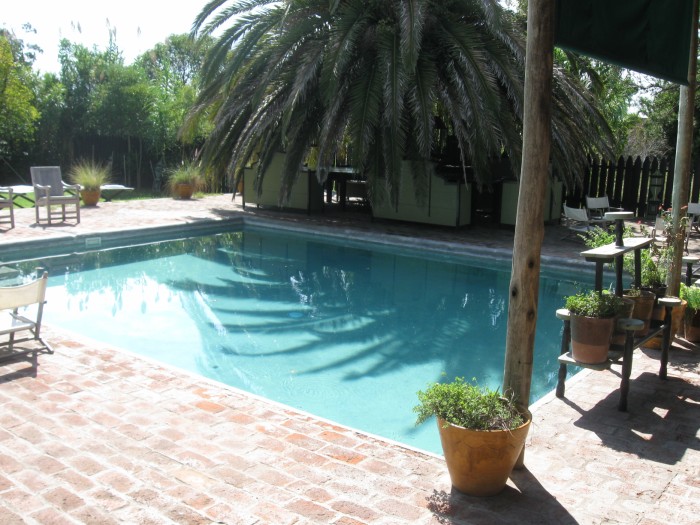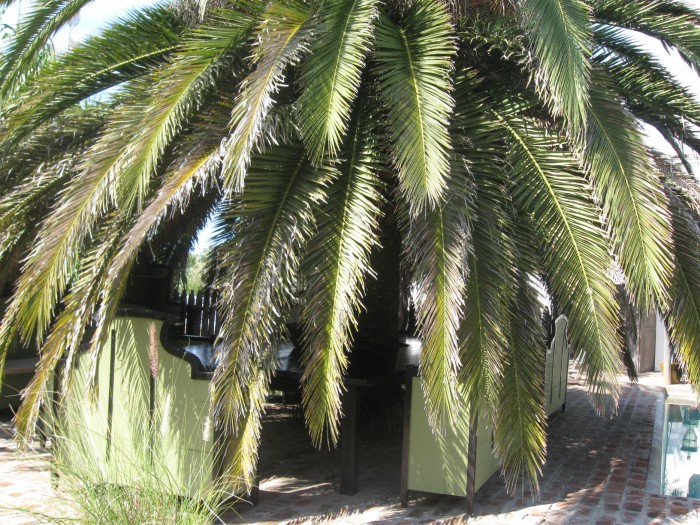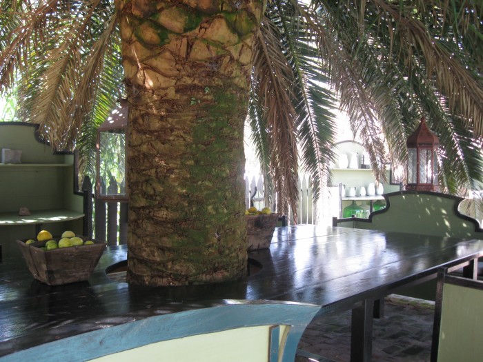 El patio del lugar es otro de los puntos altos. Una mesa armada en el centro y unos sillones rodeando un quemador de hierro, una hermosa piscina, reposeras, colchonetas en el suelo, un estupendo bar con una lona verde como alero y una espectacular y enorme palmera hace las veces de sombrillón y debajo suyo una mesa de gran tamaño rodea su tronco y conforma uno de los sitios más disfrutables seguramente de todo el establecimiento.