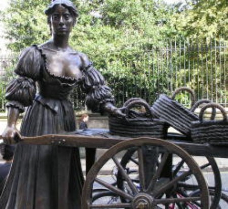 Otra calle comercial, muy famosa, es Graffon Street. Justo donde comienza nos encontramos con la estatua de la célebre Molly Malone, aquella pescadera de día y dama de alterne de noche, protagonista de la canción popular que se ha convertido en el himno no oficial de Dublín, y uno de los emblemas de la ciudad.