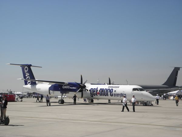 El turbohélice Q400 de Bombardier. En un rato lo abordaremos para dar una vuelta sobre Santiago.