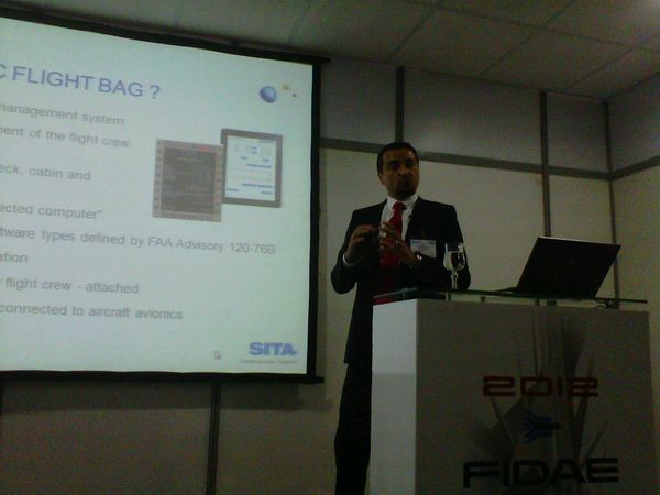 Alex Covarrubias, Vicepresidente Regional de SITA, en la presentación del revolucionario sistema EFB, que permite la comunicación directa del piloto a la base, de modo muy sencillo. Ampliaremos.