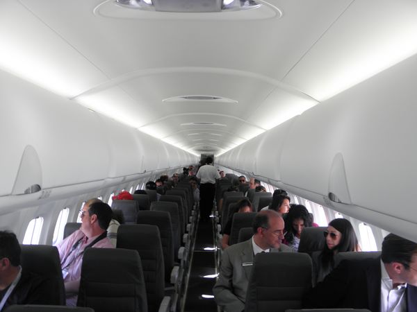 Interior del Q400 Next Gen de Bombardier. Participamos del vuelo de demostración efectuado en FIDAE, sorevolando la Cordillera de los Andes. El avión destaca por su flexibilidad operativa, su bajo costo operacional, su reducido impacto al medio ambiente, lo posicionan como una excelente opción para el transporte aéreo regional en América Latina.