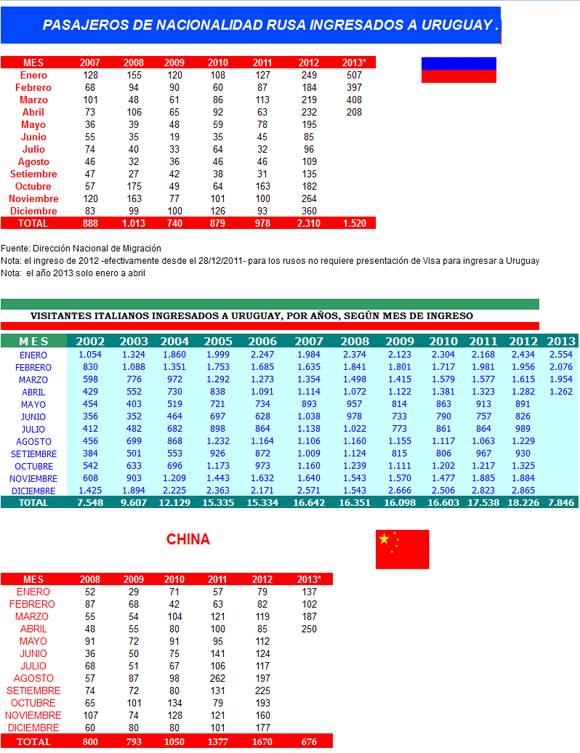 China: Nadie discute que como decían en Telecataplum, "chinito clece" y que ese mercado emisor se perfila para convertirse en "el" mercado en pocos años. Pero si, nos genera muchas dudas que cierre de modo positivo la acción de atravesar el planeta para ir a promover el golf como atractivo principal para atraer turismo de ese país (en 2012 llegaron 1.670 chinos a Uruguay). Cuando salió la noticia hace unos días en un diario de la capital, un ex-agente de viajes, conocedor como pocos del turismo receptivo y practicante de este deporte en el Club de Golf de Punta Carretas, nos dijo: "los golfistas uruguayos no quieren saber de nada con que venga gente del exterior a jugar acá y mucho menos los chinos que son conocidos en el mundo entero como destructores de campos de golf". De inmediato nos agregó, ¿no es más fácil ir a buscar golfistas brasileños a San Pablo?.