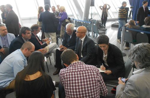 Clarck con periodistas españoles. En el vuelo inaugural vinieron 17 colegas. Alguien nos preguntó: ¿y ustedes van a España?...La respuesta fue que estamos programando nuestras vacaciones para abril de 2014