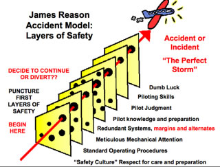 "Un avión está separado de un accidente aéreo por 6 lonchas de queso gruyere. Las lonchas representan a los que intervienen en la seguridad aérea: constructores, compañía, autoridades reguladoras, pilotos, tecnología y reglamentación. Cada loncha, como es natural en este tipo de queso, tiene unos cuantos agujeros y mayor o menor tamaño; que representan los fallos que pueden tener. Si se agrupan las lonchas en un montón, será muy poco probable que todos los agujeros coincidan; pero si es así, el avión atravesará las lonchas derivando en un accidente aéreo".