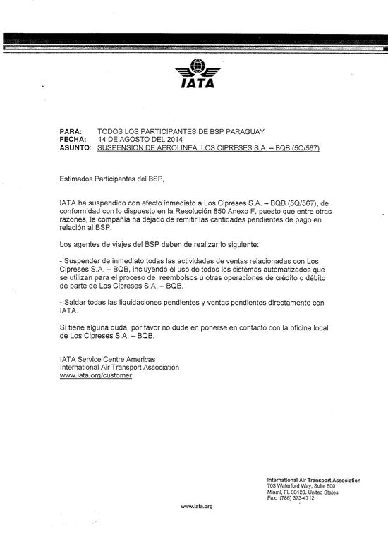 IATA ha suspendido con efecto inmediato a Los Cipreses S.A. – BQB (5Q/567), de conformidad con lo dispuesto en la Resolución 850 Anexo F, puesto que entre otras razones, la compañía ha dejado de remitir las cantidades pendientes de pago en relación al BSP.