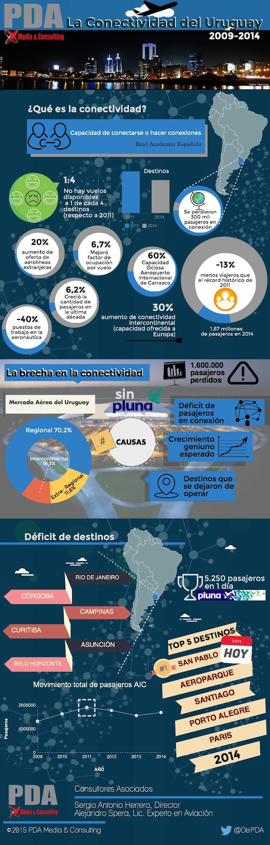 Podemos comenzar refiriéndonos a la evolución del movimiento de  pasajeros en conexión vía el Aeropuerto Internacional de Carrasco que se multiplió por 6 en apenas 3 años, pasando de algo más de 50.000 personas en 2008 a un récord de 306.000 pasajeros en 2011.  A partir del cierre de PLUNA, hubo una profunda caída en este segmento de clientes, que al 2013 cerró con apenas 18.000 pasajeros en conexión —una caída de un 94%— según datos oficiales de la DINACIA.