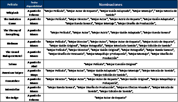 · Desde marzo se podrán ver “The Imitation Game”,“The Theory of Everything”, “Birdman” y “The Grand Budapest Hotel” todas nominadas a mejor película. Además estará “Interstellar” y “Foxcatcher”, ambas con 5 nominaciones a los premios.