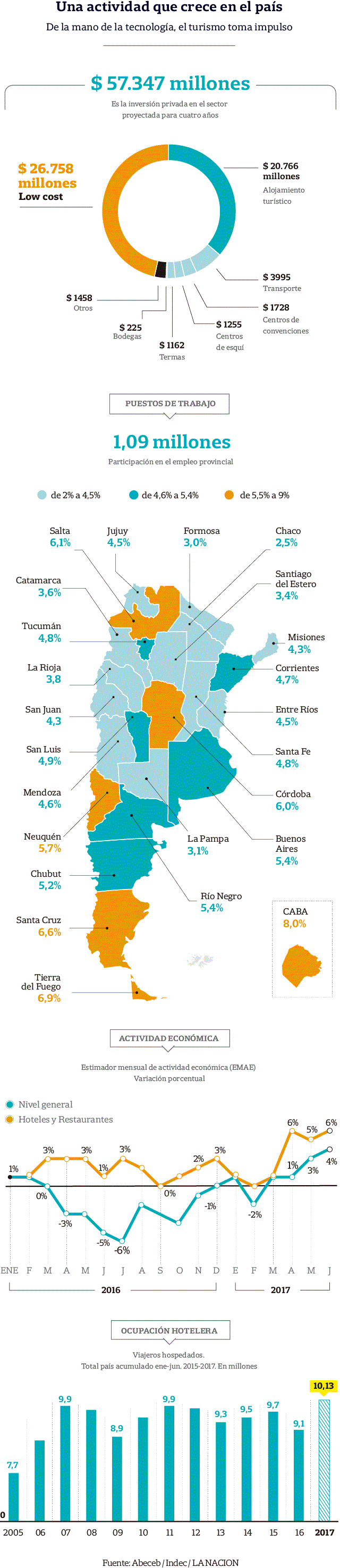 Una muestra de lo que crece el sector está dada por la inversión en hoteles: se proyectan 141 nuevos establecimientos, 89 de ellos son de empresarios independientes; 28, de cadenas internacionales, y 24, de cadenas nacionales. En 2016 y los primeros meses de este año ya se inauguraron 45. Durante la construcción y el funcionamiento de estos hoteles se generarán 29.000 puestos de trabajo directos e indirectos, según estimaciones de la citada plataforma.