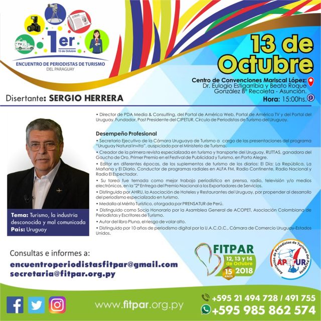 En el marco de la 15a. edición de la Feria de Turismo de Paraguay, la Asociación de Agencias de Viajes, ASATUR; la Asociación de Periodistas de Turismo de Paraguay, APETUR y la propia organización de FITPAR. cursaron oportunamente la invitación a nuestro director, Sergio Antonio Herrera para que participase, el próximo 13 de octubre, con una disertación en el Primer Encuentro de Periodistas de Turismo FITPAR 2018. "Turismo: la industria desconocida y mal comunicada" es el titulo de la presentación de Herrera. Los objetivos del encuentro buscan favorecer el intercambio y debate abierto entre colegas especializados en turismo de múltiples medios de prensa nacional, así como generar y propiciar la capacitación de los participantes por medio de ponencias de reconocidos disertantes internacionales y nacionales con experiencias positivas y de éxito que contribuya al desarrollo y crecimiento de las estrategias de promoción turística del Paraguay.