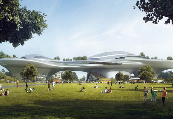 El complejo, diseñado por el estudio de arquitectura MAD, con sedes en Beijing (de donde es originario) y en Nueva York, tiene la inconfundible forma de una nave espacial, con formas suaves y curvilíneas bastante aerodinámicas, que permiten pensar que en cualquier momento saldrá disparada hacia las estrellas. Esta sensación se fomenta desde su base, sostenida por tres torres que permiten un generoso espacio al aire libre bajo el edificio, sin duda, buen sitio donde sentirse a salvo del ataque de los clones (o similares).