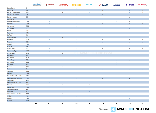 Como podemos ver en el siguiente cuadro, Aerolíneas Argentinas/Austral es la compañía con mayor presencia, alcanzando 36 destinos dentro del país; le sigue Flybondi con 15 destinos y completa el podio LATAM Argentina con 13.
