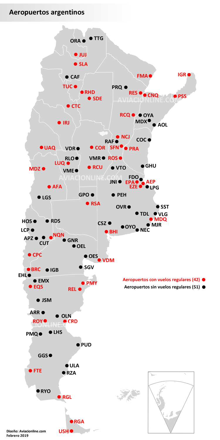 De los 42 aeropuertos con vuelos regulares, 6 cuentan con una oferta doméstica compuesta por seis aerolíneas (Aeroparque, Córdoba, Mendoza, Puerto Iguazú, Bariloche y Salta), 18 aeropuertos tienen una oferta de entre 2 y 5 aerolíneas, mientras que también otros 18 aeropuertos solo tienen una sola aerolínea operando de manera regular (en 13 de ellos, Aerolíneas Argentinas/Austral; en Reconquista y Rio Hondo, Avianca, en ambos casos hasta fin de mes, y en el segundo desde marzo retomaría Aerolíneas Argentinas; en Río Mayo, LADE; en Puerto Madryn, Andes; y en Sunchales, Flyest).
