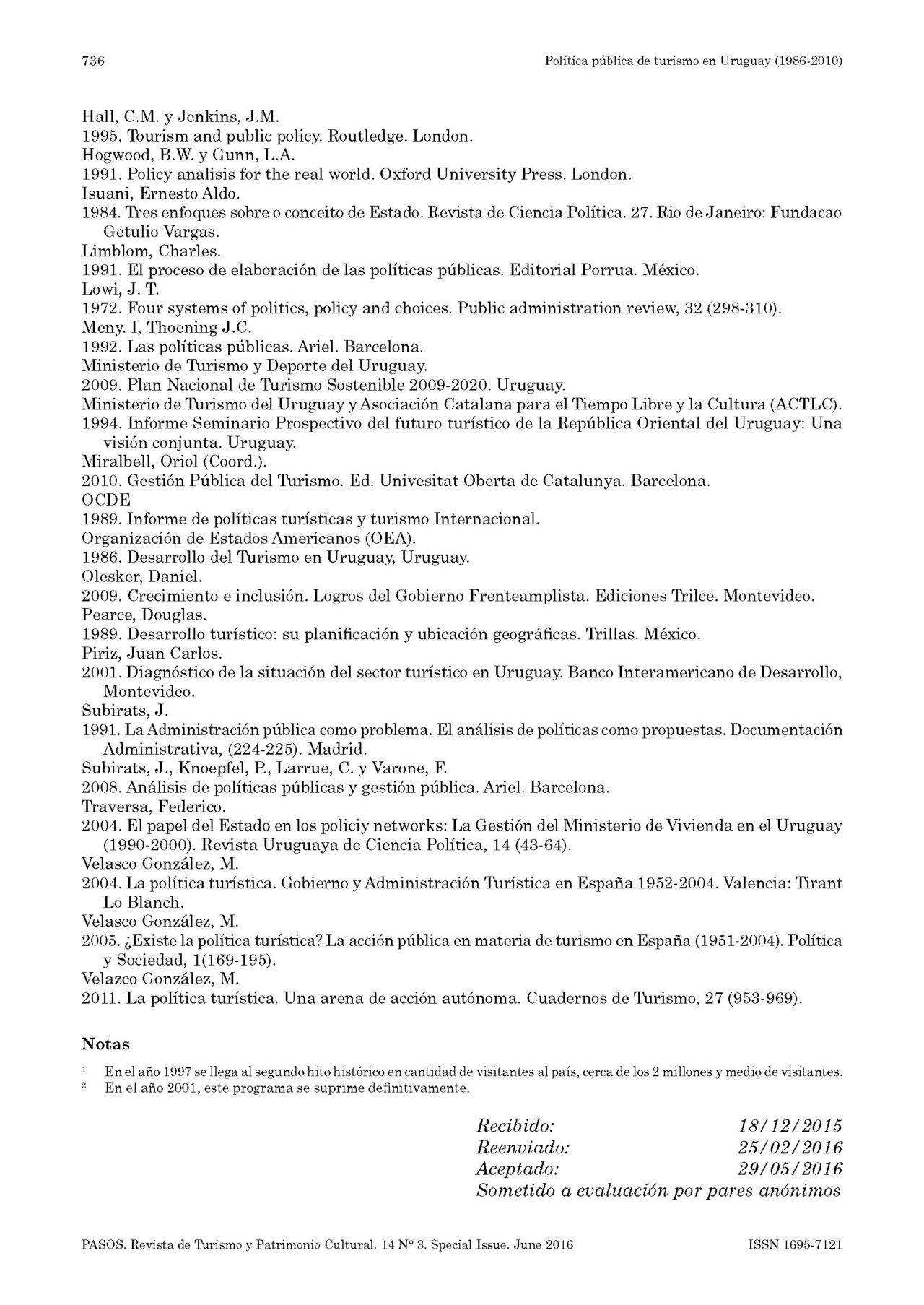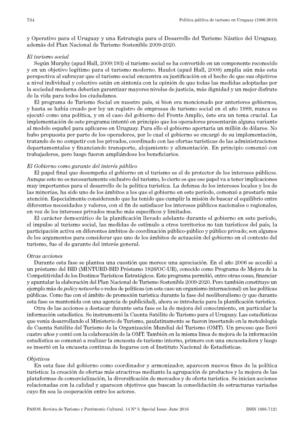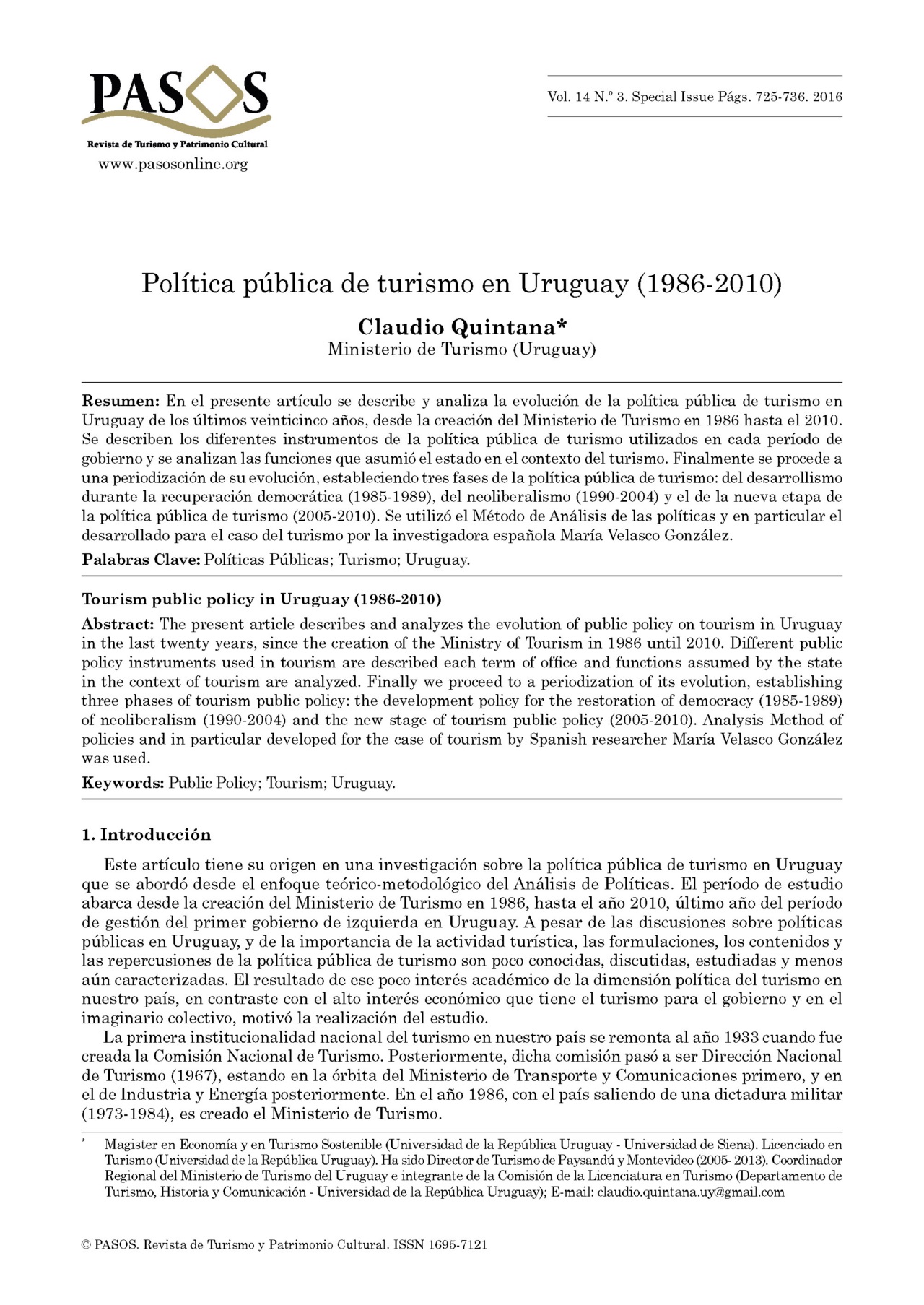 Accedimos a una publicación en la revista PASOS, señalada como Vol. 14 N.o 3. Special Issue Págs. 725-736. 2016 con el título Política pública de turismo en Uruguay (1986 -2010) Claudio Quintana* Ministerio de Turismo (Uruguay). El resumen que encabeza dicho trabajo dice textualmente: "En el presente artículo se describe y analiza la evolución de la política pública de turismo en Uruguay de los últimos veinticinco años, desde la creación del Ministerio de Turismo en 1986 hasta el 2010. Se describen los diferentes instrumentos de la política pública de turismo utilizados en cada período de gobierno y se analizan las funciones que asumió el estado en el contexto del turismo. Finalmente se procede a una periodización de su evolución, estableciendo tres fases de la política pública de turismo: del desarrollismo durante la recuperación democrática (1985-1989), del neoliberalismo (1990-2004) y el de la nueva etapa de la política pública de turismo (2005-2010). Se utilizó el Método de Análisis de las políticas y en particular el desarrollado para el caso del turismo por la investigadora española María Velasco González". Compartimos la publicación.