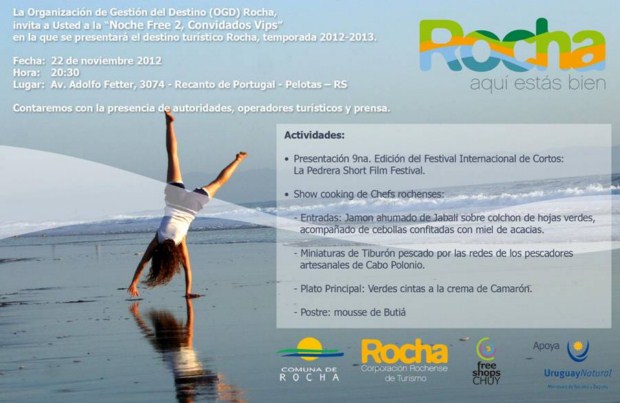 La Organización de Gestión del Destino Rocha se presentará este 22 de noviembre a las 20:30 horas en la ciudad de Pelotas, estado de Río Grande del Sur, Brasil. La actividad incluye la presentación del 9º Festival de Cortos de La Pedrera, y un Show Cooking de varios Chefs del departamento.