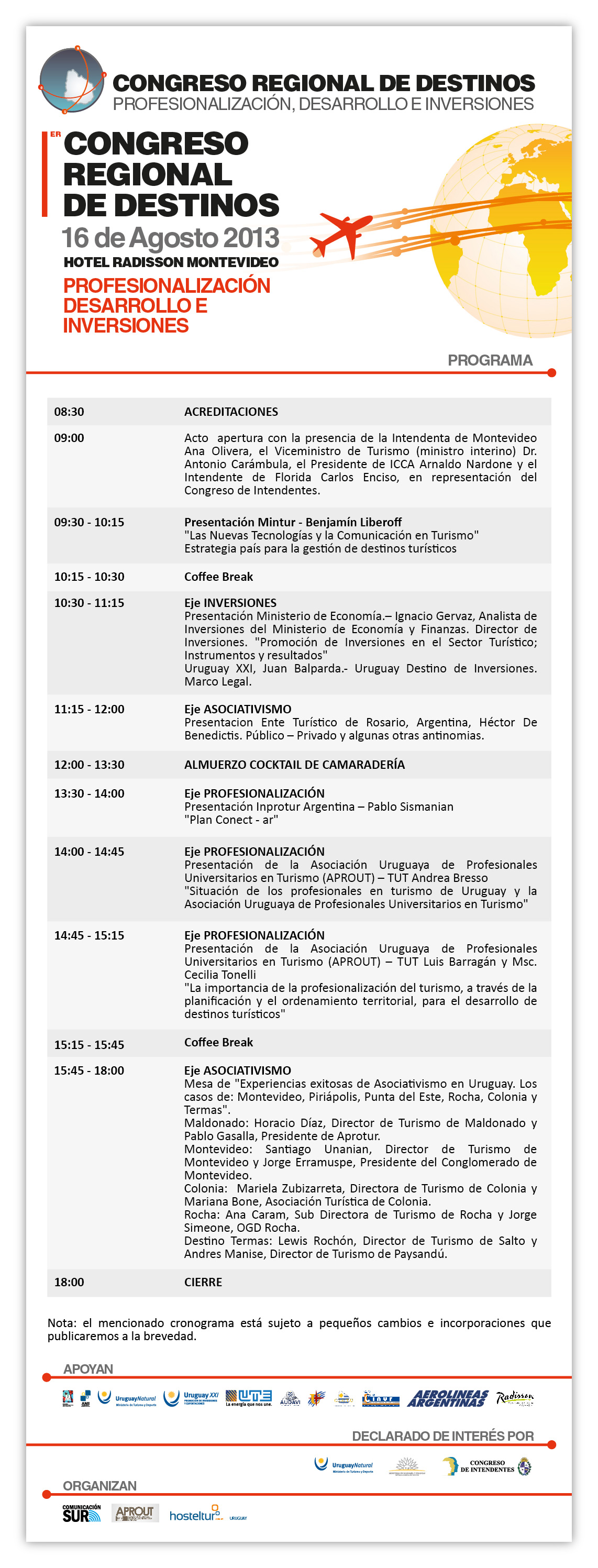 Este miércoles 16 de agosto a partir de la hora 8:30 tendrá lugar en el Radisson de Montevideo el Primer Congreso Regional de Destinos. Las temáticas a desarrollar se basan en tres ejes principales: Inversiones,Profesionalización y Asociativismo.