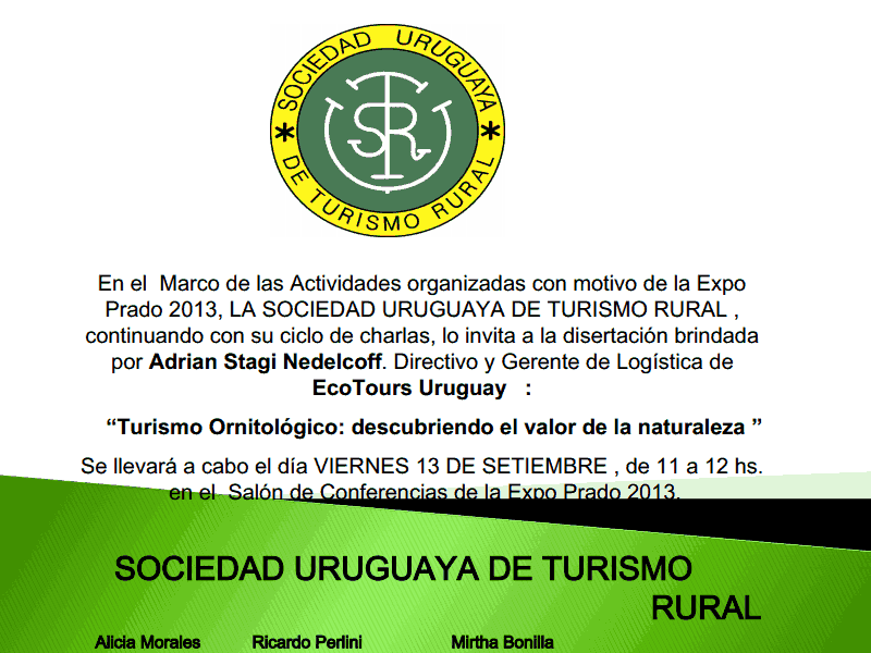Este viernes 13 a las 11 horas en la sala de conferencias de la Expo Prado, se llevará a cabo la charla organizada por la Sociedad Uruguaya de Turismo Rural, "Turismo Ornitológico: descubriendo el valor de la naturaleza", la cual será dictada por Adrián Stagi Nedelcoff, Directivo y Gerente de Logística de EcoTours Uruguay.