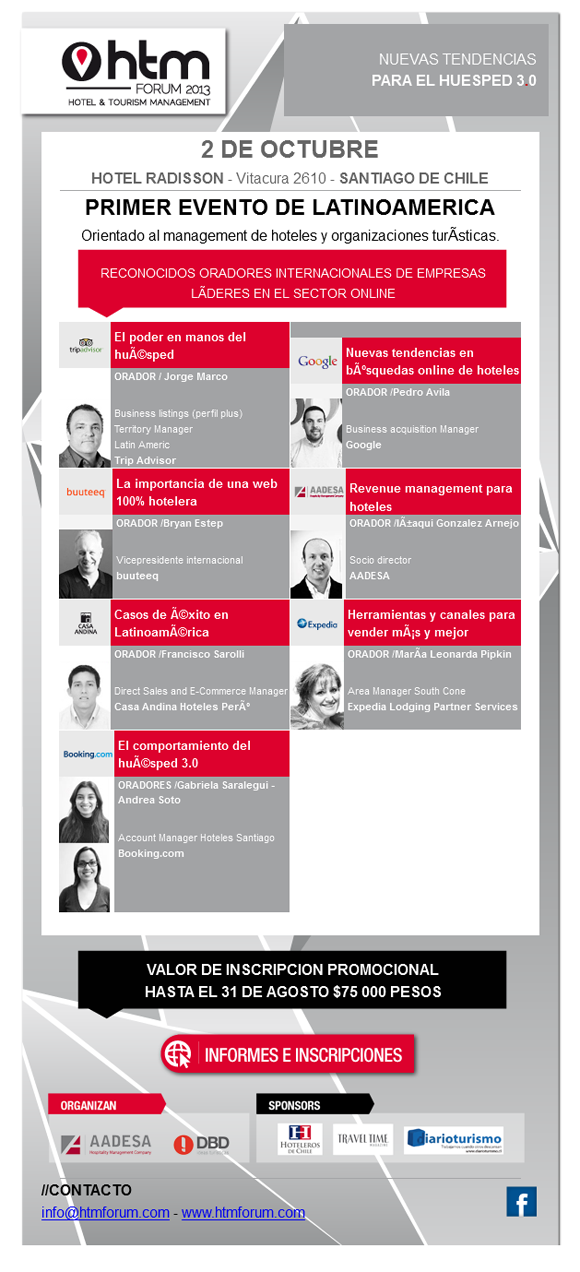 Hotel & Tourism Management Forum 2013 será el primer evento de Latinoamérica orientado al management de hoteles y organizaciones turísticas. Se realizará el próximo 2 de octubre en el Hotel Radisson de Santiago de Chile, con la presencia de destacados panelistas.