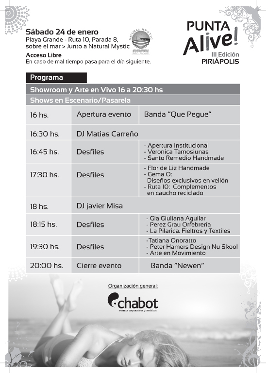 Este sábado 24 a partir de la hora 16, comenzará en la parada 8 de la ruta 10, Playa Grande, Piriápolis, la tercera edición del evento Punta Alive. A continuación destacamos su programación.
