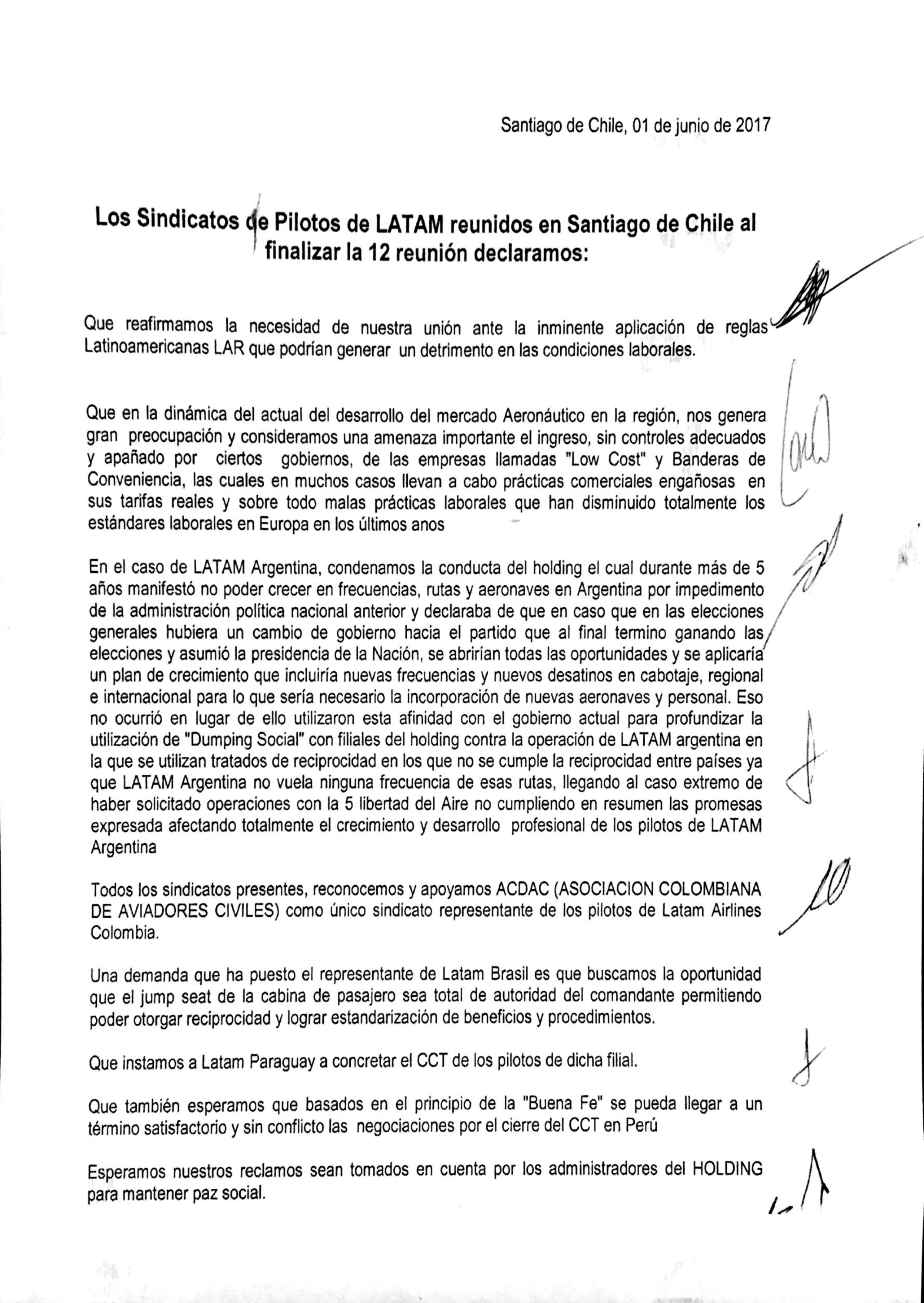 Los Sindicatos de Pilotos de Latam, luego de finalizada su 12ª reunión en Santiago de Chile, emitieron el Comunicado que publicamos a continuación.