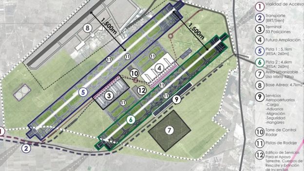 El proyecto de López Obrador consiste básicamente en construir dos pistas -una de 5,1 km y otra de 4,6 km-, un edificio terminal con 33 posiciones y una torre de control en la base militar de Santa Lucía, para complementar el actual aeropuerto Benito Juárez capitalino.