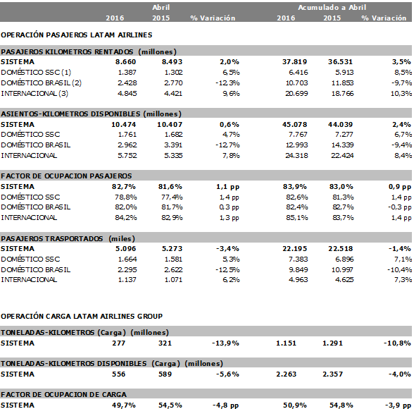 La siguiente tabla resume las estadísticas operacionales para el mes y acumulado del año para las principales unidades de negocio de LATAM: