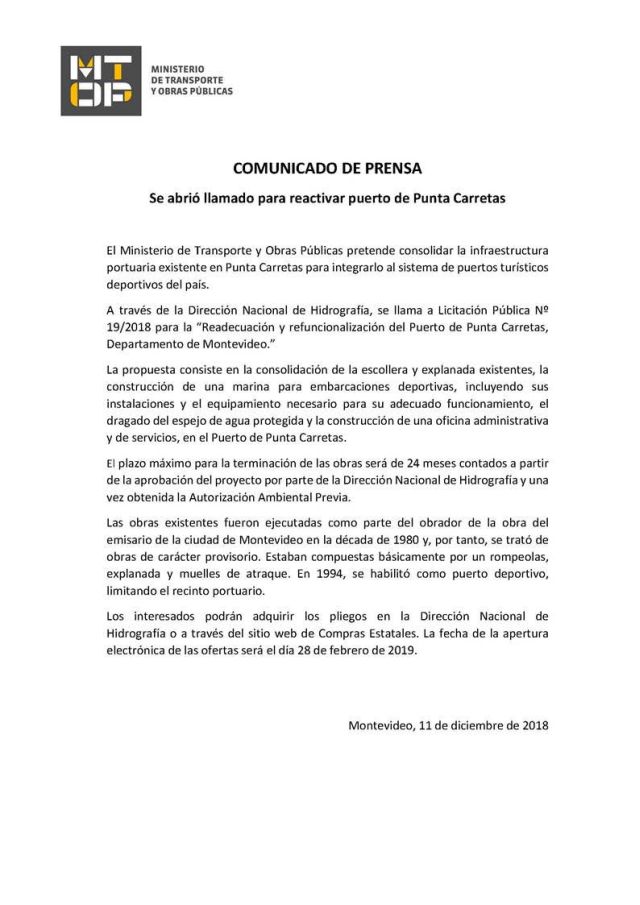 El Ministerio de Transporte y Obras Públicas pretende consolidar la infraestructura portuaria existente en Punta Carretas para integrarlo al sistema de puertos turísticos deportivos del Uruguay. A esos efectos emitió el Comunicado que publicamos a continuación.