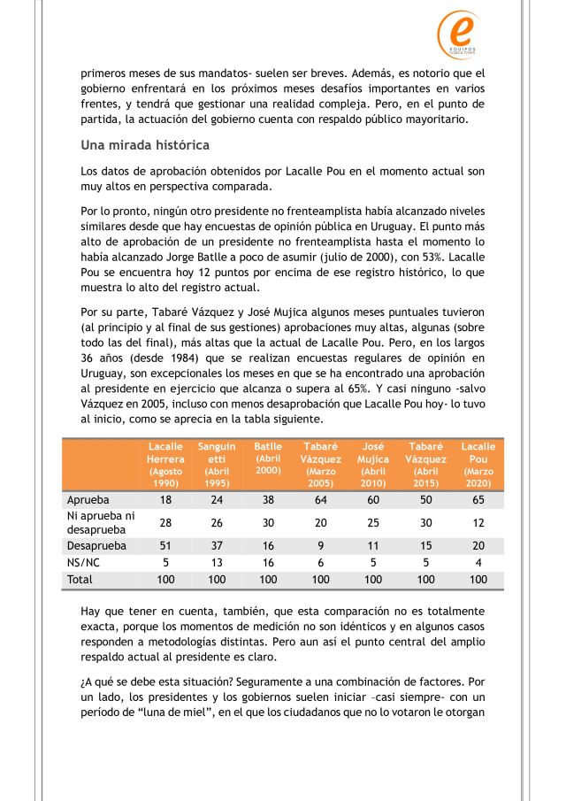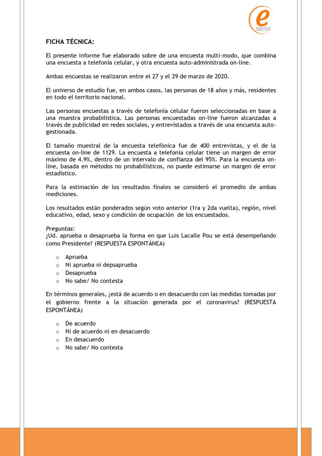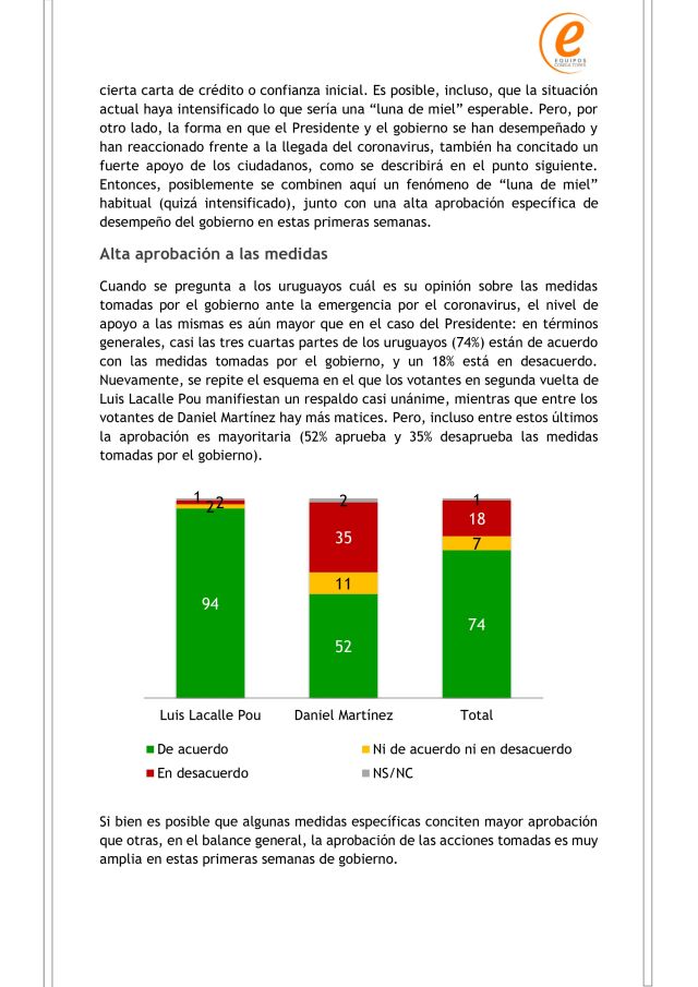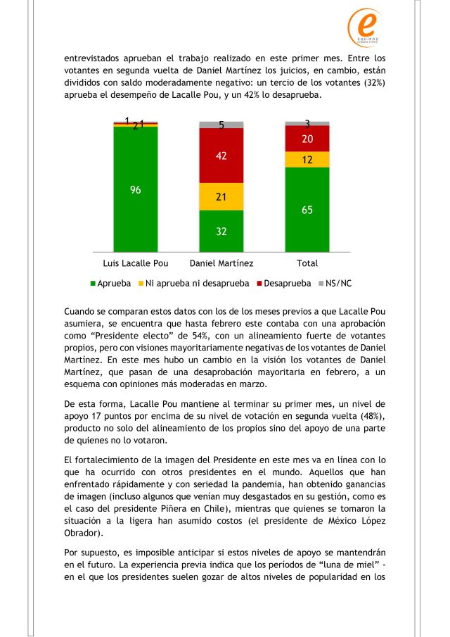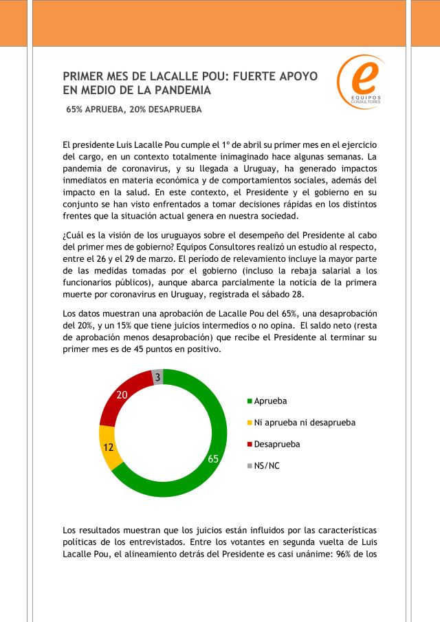 La encuesta fue realizada entre el 26 y 29 de marzo, y le da a Luis Lacalle Pou un 65% de aprobación y un 20% de desaprobación. El 15% restante no aprueba ni desaprueba, o directamente no contesta. Hasta febrero, Lacalle Pou contaba con una aprobación