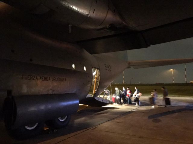 Luego de un viaje de 26 horas, a las 02:00 del día de hoy arribó la aeronave C-130 "Hércules" al Aeropuerto Internacional de Carrasco “Cesáreo L. Berisso” con un total de 58 ciudadanos uruguayos que se encontraban varados en Bogotá, Asunción y Santa Cruz. Fueron recibidos por el ministro de Defensa Nacional, Dr. Javier García, el Comandante en Jefe de la Fuerza Aérea Uruguaya, General del Aire, Luis H. De León, quienes asimismo saludaron y agradecieron a la tripulación del C-130.