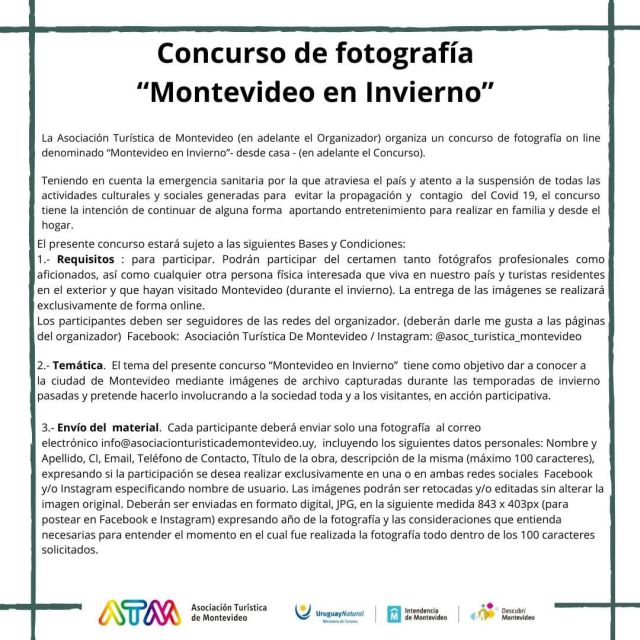 La Asociación Turística de Montevideo organiza un concurso fotográfico on line, con la intención de seguir aportando entretenimiento para realizar en familia y desde el hogar. El plazo para participar vence el 20 de abril. Publicamos el llamado.