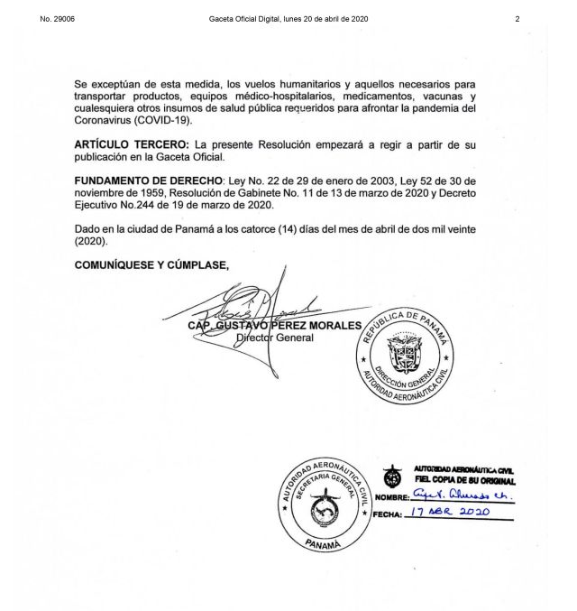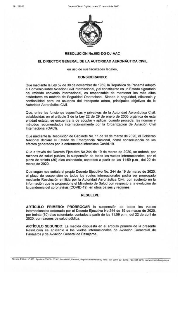 En Panamá, en la Gaceta Oficial Digital, de fecha lunes 20 de abril de 2020, se lee que el Director General de la Autoridad Aeronáutica Civil, en uso de su facultades legales, luego de los considerandos de orden, resuelve: Artículo Primero: PRORROGAR la suspensión de todos los vuelos internacionales ordenada por el Decreto Ejecutivo No. 244 de 19 de marzo de 2020, por treinta (30) días calendario, contados a partir de las 11.59 PM del 22 de abril de 2020, por razones de salud pública. Artículo Segundo: La medida dispuesta en el artículo primero de la presente Resolución es aplicable a los vuelos internacionales de Aviación Comercial de Pasajeros y de Aviación General de Pasajeros. Compartimos el texto completo de la resolución.