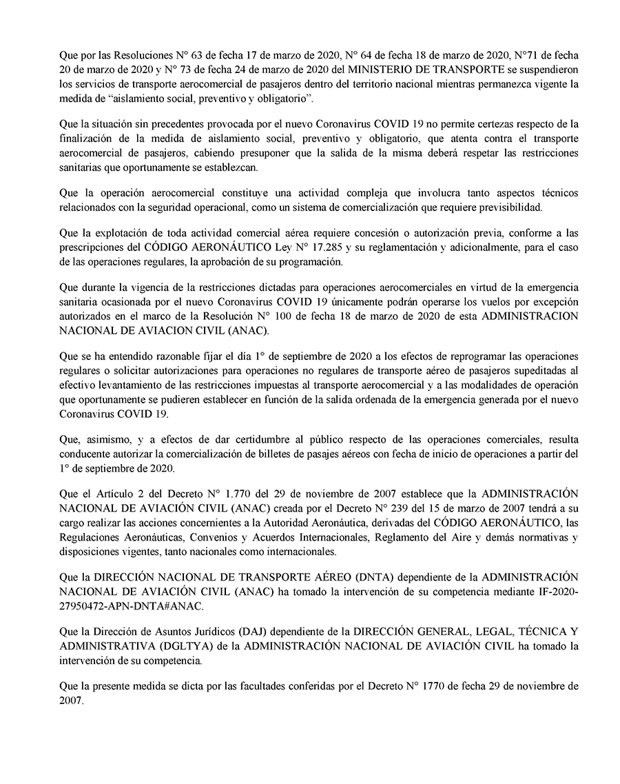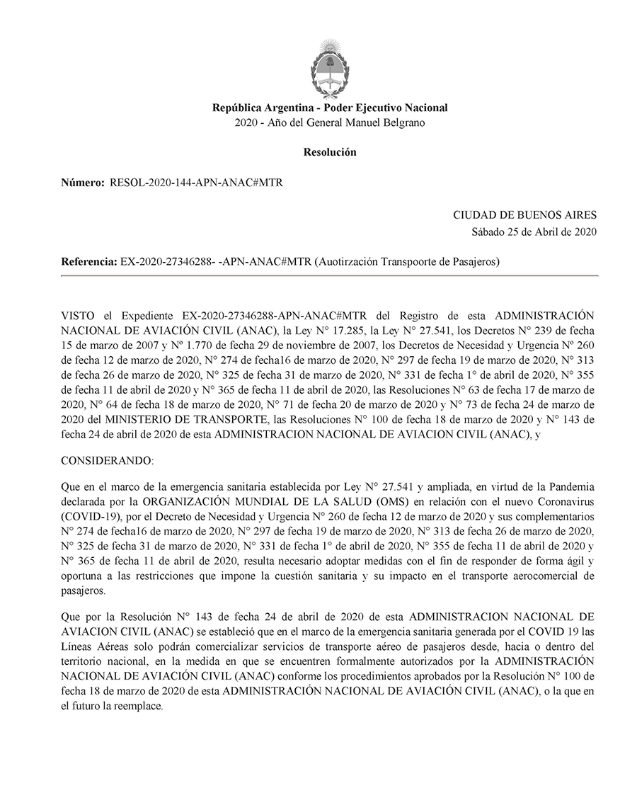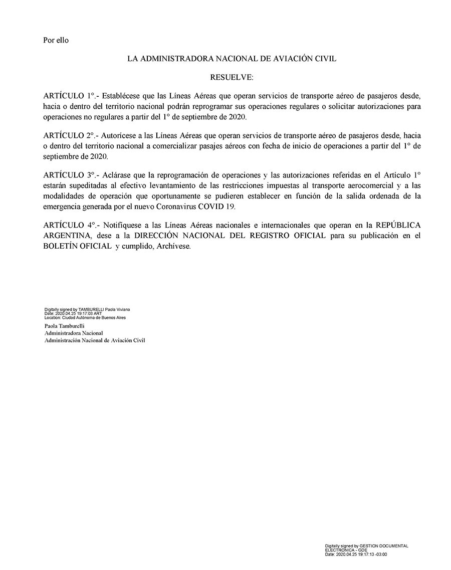 A continuación del abrupto, controversial y cuestionado cierre de operaciones aéreas del pasado mes de marzo, las autoridades aeronáuticas del vecino país, en primera instancia habían anticipado que se prohibía la emisión de pasajes aéreos internacionales, para posteriormente, con fecha del sábado 25 de abril, emitir una resolución, la cual compartimos, por la que fija el 1 de setiembre como fecha de reanudación de vuelos "desde, hacia y dentro de la Argentina". Estos anuncios han sido resistidos por diferentes actores de la industria, inquietos por la extensión del "parate" obligatorio que regirá por los próximos cuatro meses. En las próximas horas, nuestro columnista Luis Alejandro Rizzi, desde Buenos Ares, continuará con el análisis de esta preocupante situación.