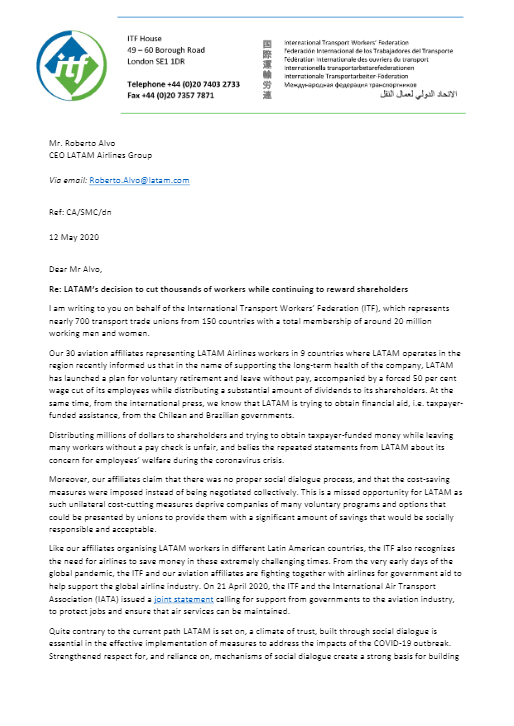 Nuestros 30 sindicatos afiliados de aviación que representan a los(as) trabajadores(as) de LATAM Airlines en 9 países de la región donde LATAM opera, nos han informaron recientemente que para apoyar la solidez de la compañía a largo plazo, LATAM ha lanzado un plan para el retiro voluntario y licencias sin goce de sueldo, incluyendo un forzado recorte salarial del 50 por ciento de sus empleados(as), mientras se distribuye una cantidad sustancial de dividendos a sus accionistas. Al mismo tiempo, a través de la prensa internacional, sabemos que LATAM está tratando de obtener ayuda financiera de los gobiernos de Chile y Brasil, es decir, asistencia financiada por los impuestos de contribuyentes.