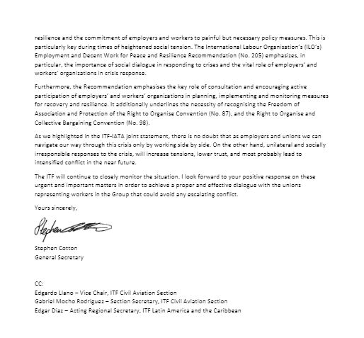 La ITF continuará monitoreando de cerca esta situación. Espero su respuesta positiva sobre estos asuntos urgentes e importantes para lograr un diálogo adecuado y efectivo con los sindicatos que representan a los(as) trabajadores(as) en el Grupo, que podrá evitar que se intensifique cualquier conflicto.