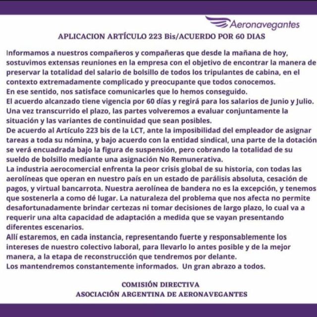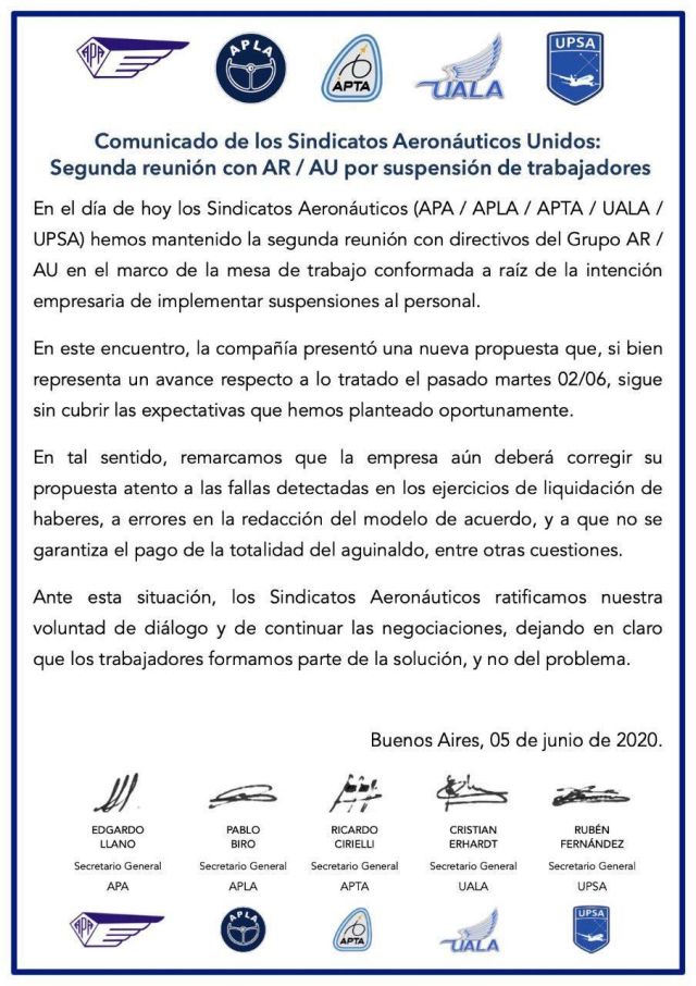 En la República Argentina, los gremios de la aviación están movilizados y de reunión en reunión con el gobierno. Los dos últimos comunicados que hemos recibido.
