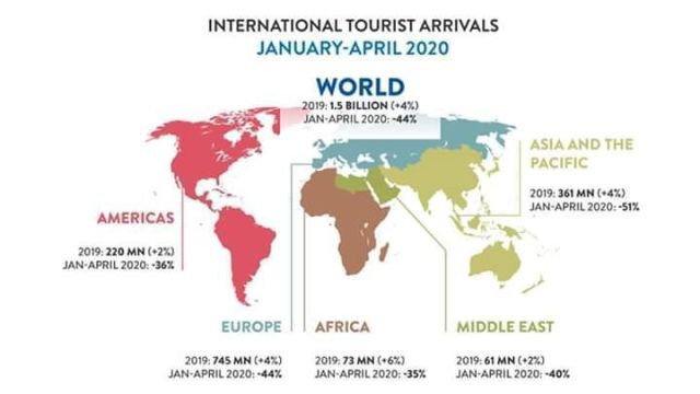 Si bien se esperaba que abril fuera una de las épocas más activas del año debido a las vacaciones de Pascua, la introducción casi universal de las restricciones de viaje provocó una caída del 97% en las llegadas de turistas internacionales, luego de una disminución del 55% en marzo. Entre enero y abril de 2020, las llegadas de turistas internacionales disminuyeron en un 44%, lo que se tradujo en una pérdida de aproximadamente US $ 195 mil millones en ingresos por turismo internacional.