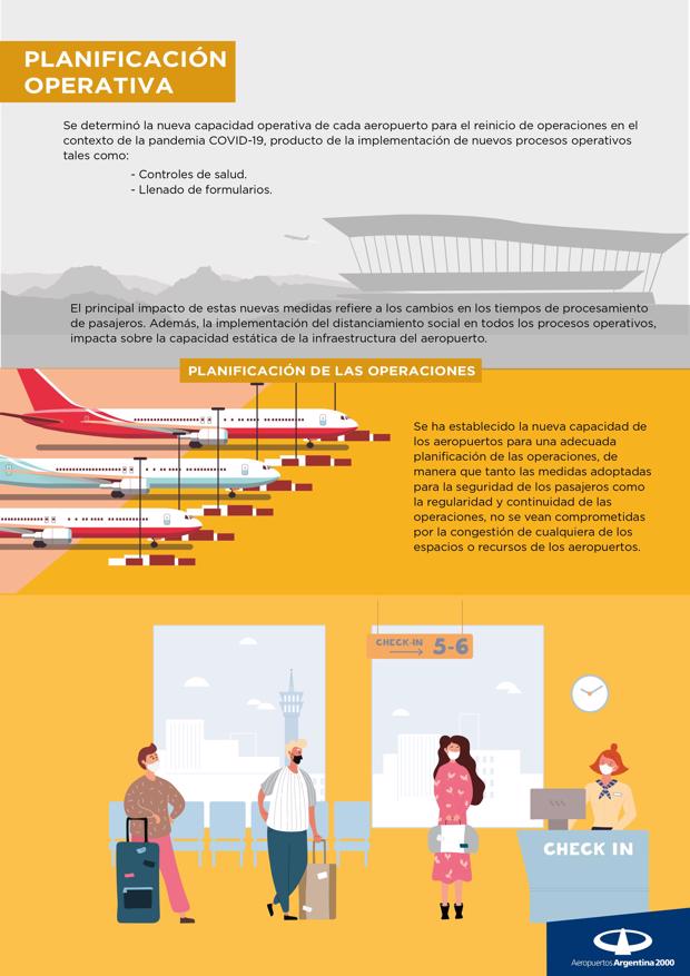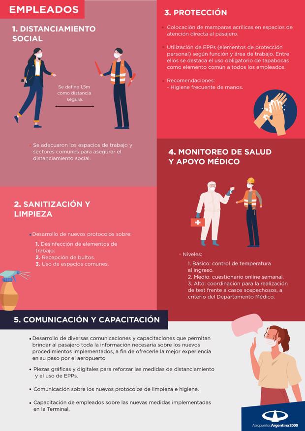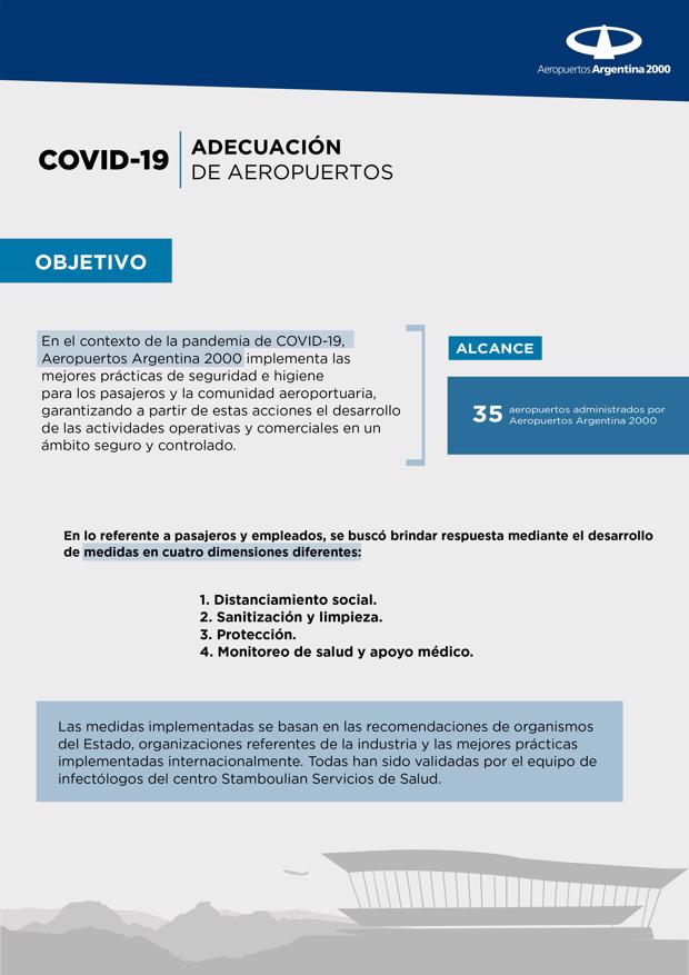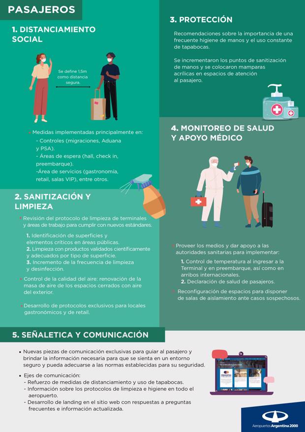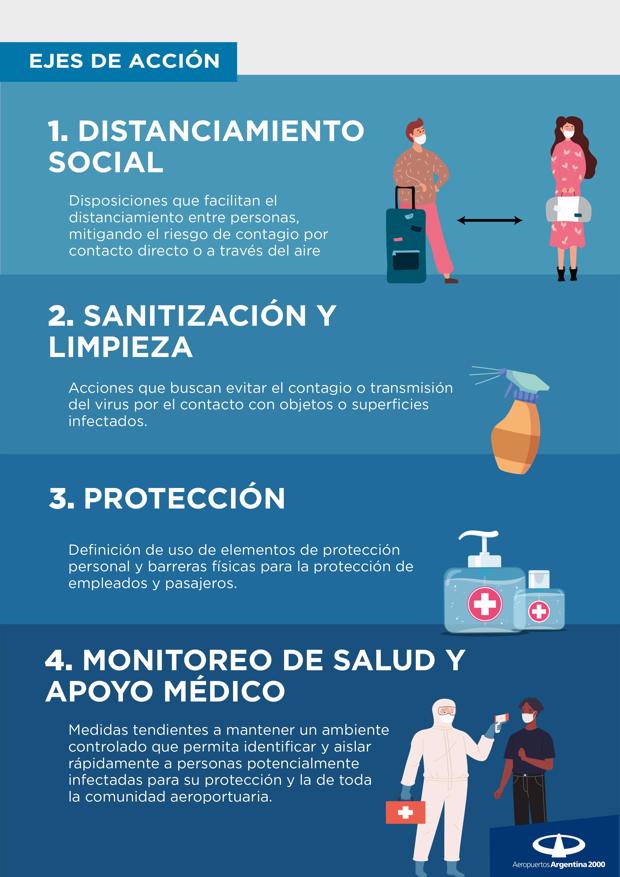 De cara al regreso de las operaciones aéreas, el objetivo es cuidar a los pasajeros y usuarios y minimizar las posibilidades de contagio cumpliendo todos los protocolos establecidos que siguen las pautas de la asociación mundial de aeropuertos, y que permitieron retomar la actividad en los países en los que se está dejando atrás la pandemia. Para lograr este objetivo se están desarrollando medidas especiales como: controles de síntomas y tests al ingresar a los aeropuertos, reasegurar el distanciamiento social dentro de las terminales con señalética en pisos, cartelería y asientos, desinfecciones continuas de puntos de alto contacto (carros de valijas, terminales de autoservicio, etc), y capacitaciones en prevención a todos los trabajadores de la comunidad aeroportuaria, además del uso obligatorio de tapa bocas. El objetivo es proveer información clara y específica y como anfitriones brindar la atención que el pasajero y el usuario necesita en estos tiempos.