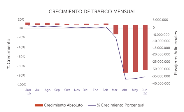 El mercado doméstico de Brasil – el mayor de la región – que había registrado caídas superiores al 90% en abril y mayo, decreció 87% en junio, lo que muestra, como anteriormente lo mencionamos, que la industria de la aviación comercial está empezando a reiniciar de a poco. Es muy probable que en julio y agosto continuemos viendo mejoras paulatinas con la reapertura de otros mercados.